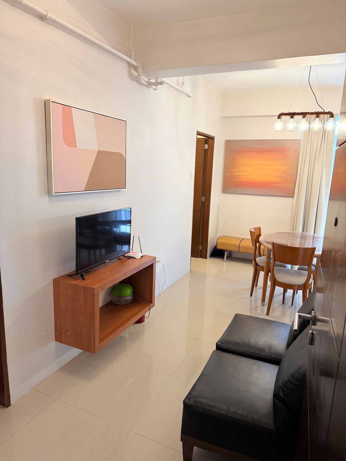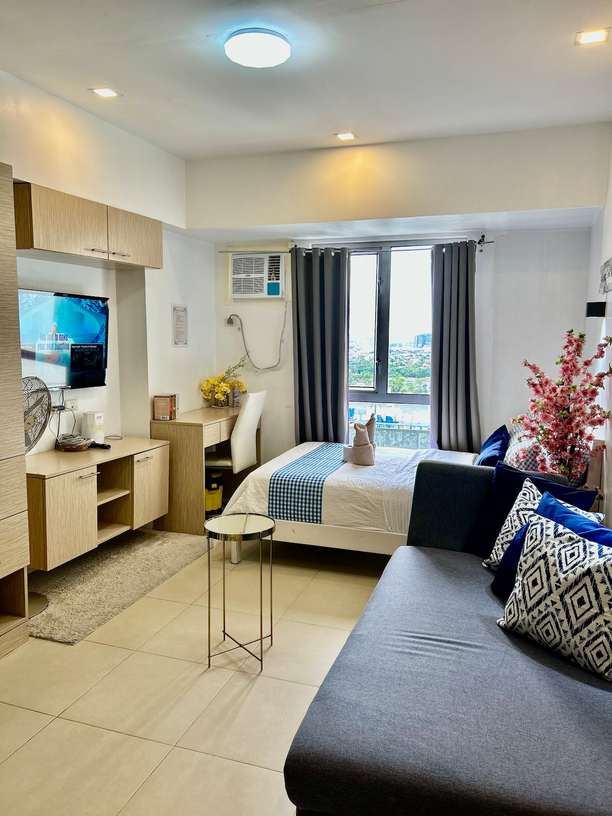 Stay in this charmingly stylish studio condo that is fully furnished and tastefully decorated with fine art selections. This stylish place is close to must-see destinations of Cebu City and Mandaue City. It is located near church, hospital, banks and just 30mins away from Mactan Airport and just 10mins from Ayala Center and SM City Cebu shopping malls. It has internet, double bed, ref, smart TV, workdesk, induction cooker, rice cooker, plates, mugs and utensils. Comes with towels and sheets.