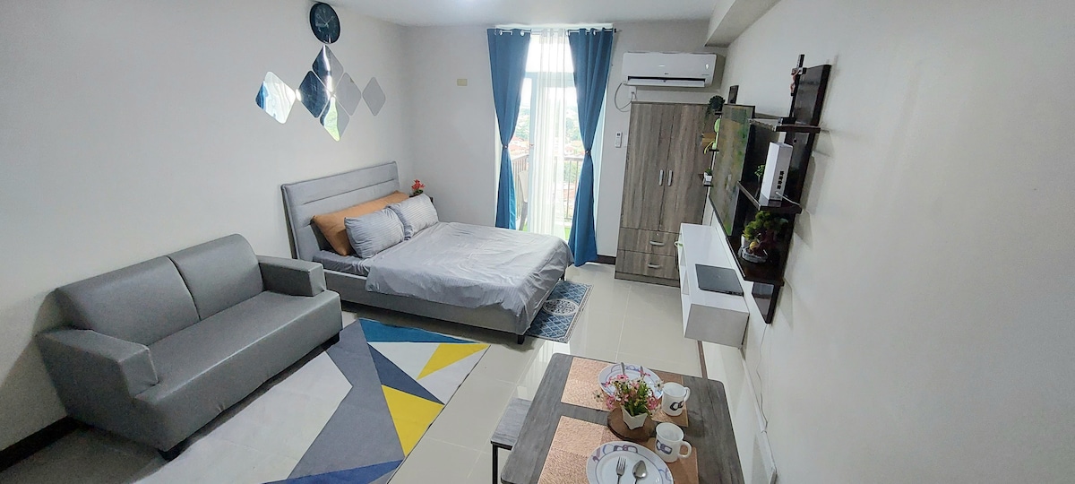 Comfy, accessible, and aesthetic condo studio unit near Mactan Cebu International Airport 24 sqm condo unit with balcony Oceanview with Queen-sized bed • can fit 4-6 pax • extra foam mattress and extra blanket provided • free pool access for 2, paid parking inside Bathroom with: • shower, heater, bidet • shampoo | conditioner | body gel provided • towels Entertainment • 200 mbps internet connection • 1080p 4K Smart Projector with surround sound • Mini karaoke • Card and board games