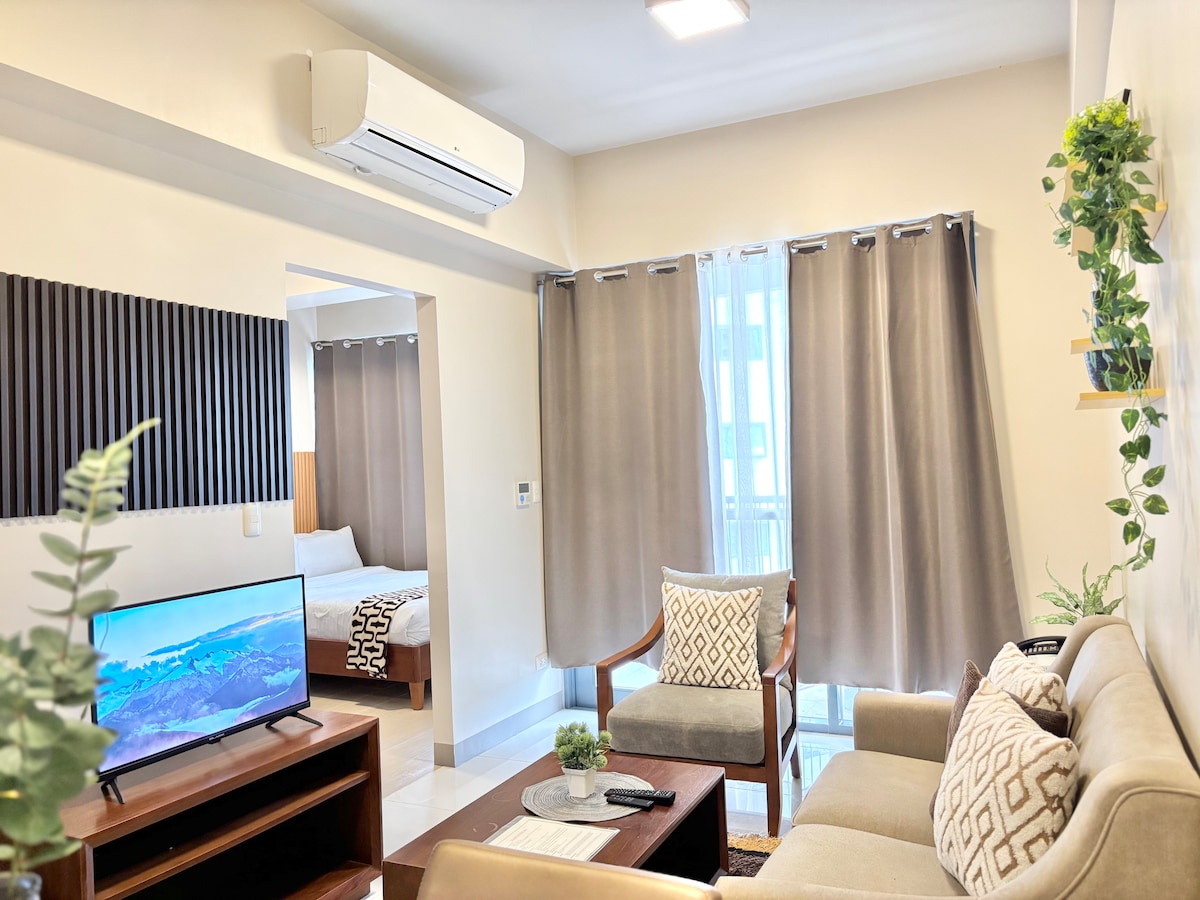 Earth tones and neutrals make one cozy home. Have a peaceful and pleasant stay in this stylish 1Bedroom condo unit located at the city center featuring a queen-sized bed, comfortable living room furniture, dedicated workspace, and a kitchen equipped with basic appliances, tableware & cooking utensils, perfect for short stays or long-term stays.