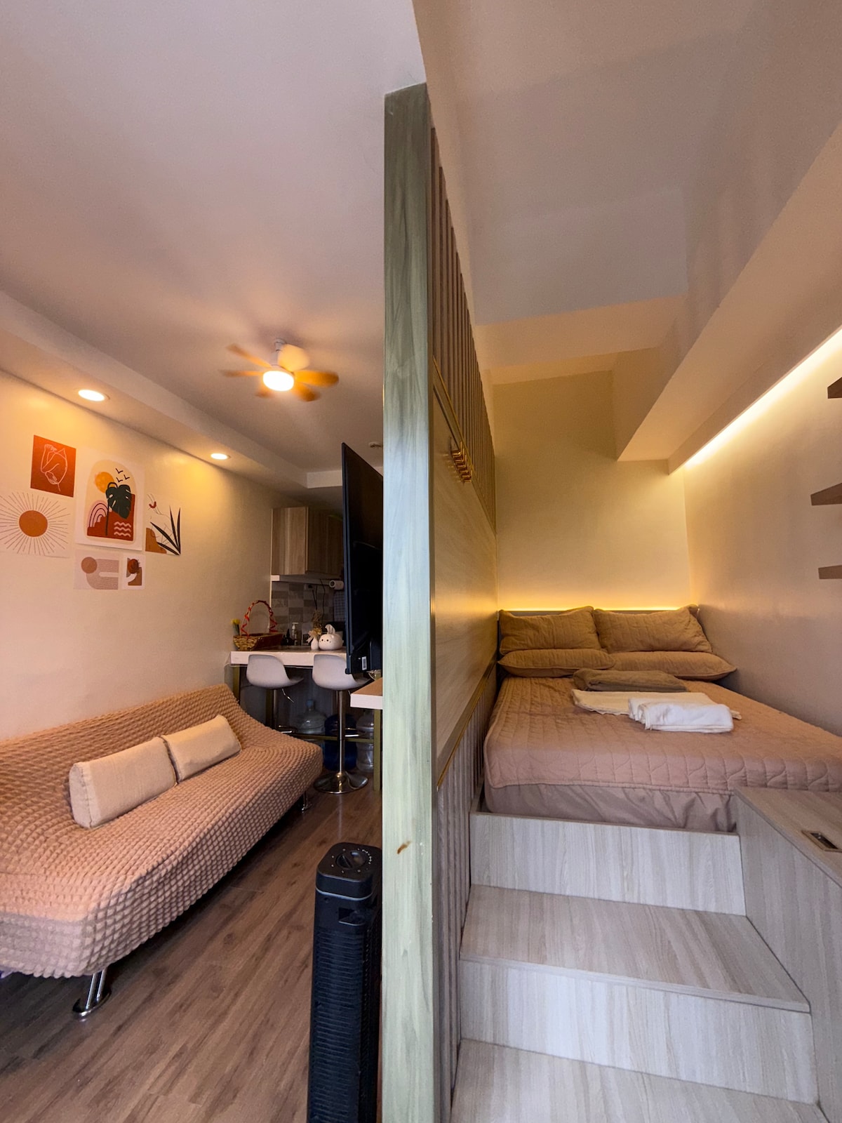 Unwind at Nookō Studio—a Zen-inspired corner unit with balcony, elevated queen bed, single sofabed, and 4K cinema projector. Just minutes from Cebu IT Park and JY Square, where rides to mountain spots like Tops and Temple of Leah await. PUJ routes to Cebu Business Park and Downtown are also few walks away. Enjoy pools, gym, and gardens in a peaceful setting. Perfect for solo travelers, couple, or a group of three.