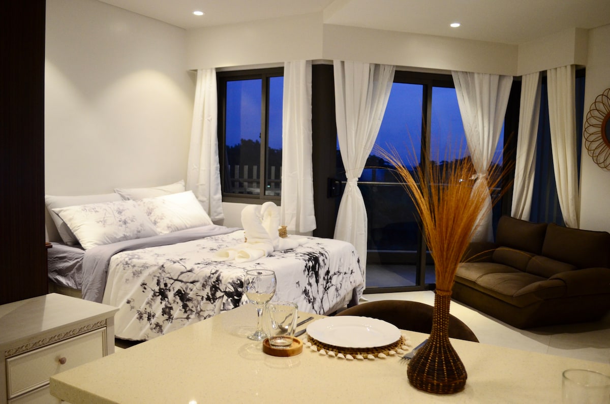 This comfortable and lovely 1BR Suite is your home away from home. Located on the high floor where you will find peace and tranquility, watching the sunrise and sunset in your own private patio. The patio has a view of the sea and lush greenery. All furnitures were meticulously picked and thoughtfully arranged to provide a homey feeling to all our guests. It is also equipped with high-speed internet, 55" smart TV in the living room, 43" in the bedroom and fully equipped kitchen.