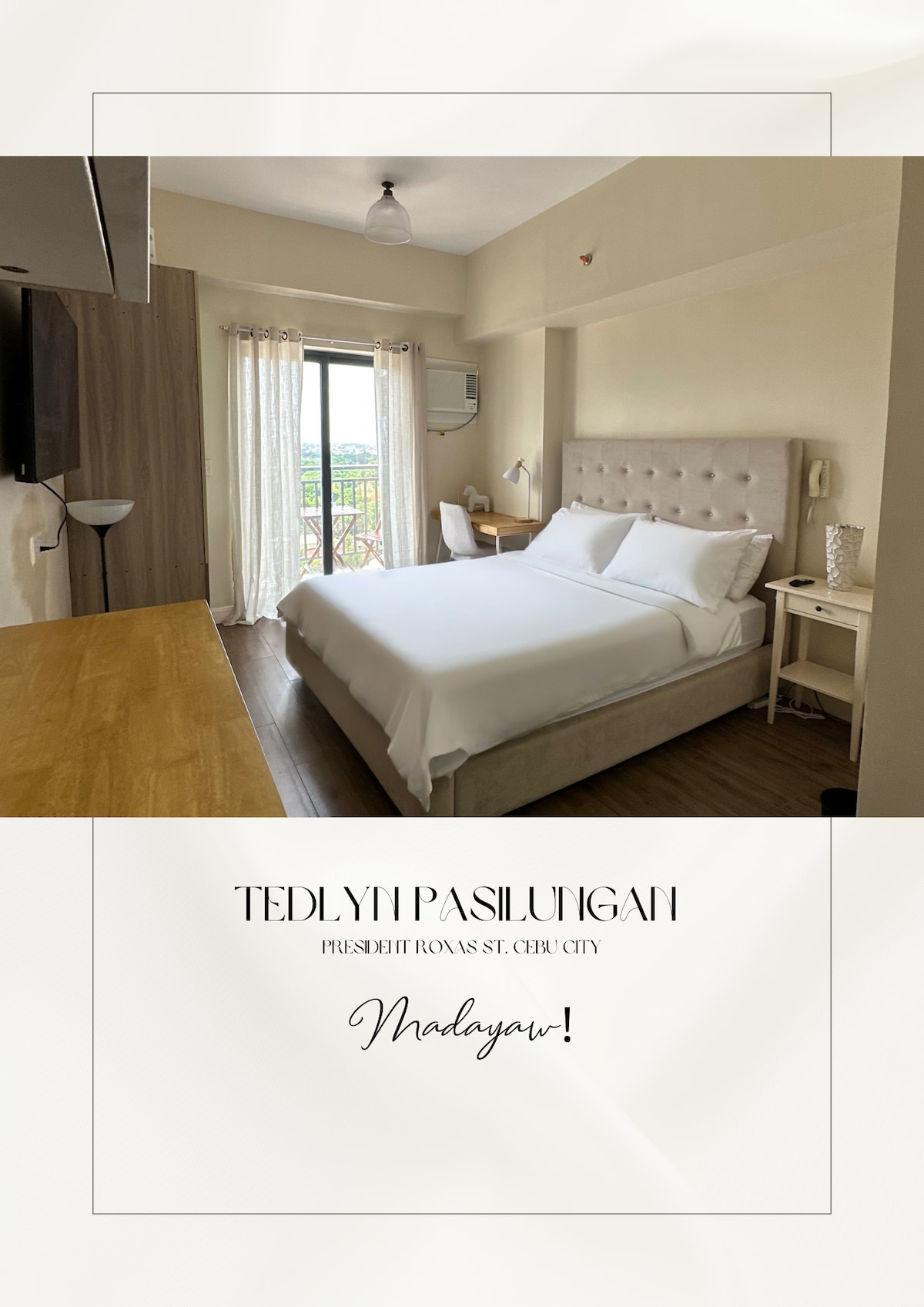 Bahandi Suites Unit 2: Central, 22 sqm Comfortable Studio at The Median Condominium, Lahug, Cebu City. This modern studio offers a king-size bed, reliable high-speed WiFi, and pool access for a convenient city stay. The location is highly practical, within walking distance to IT Park, Ayala Mall Central Bloc, Sugbo Mercado, and JY Square Mall, giving you easy access to shopping, food choices, and entertainment in the heart of Cebu.