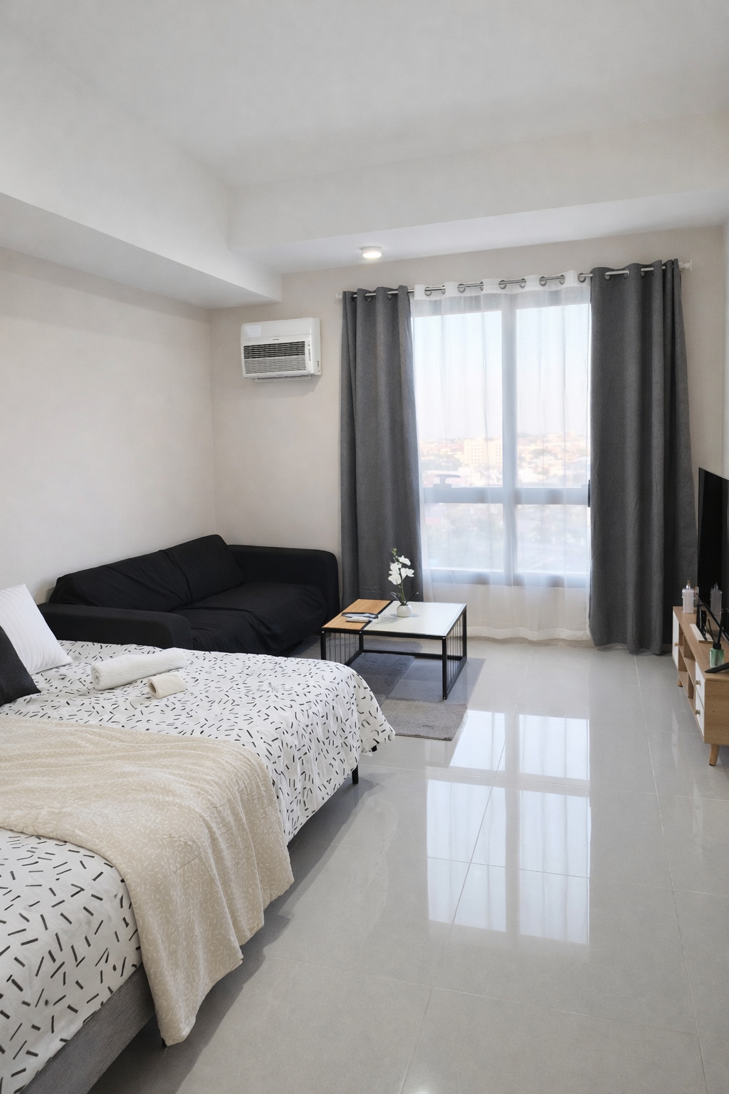 Experience high-end living in this prime 22nd-floor luxury studio at Park Avenue 38, IT Park, offering elegant city and bay views. Good for four people. Enjoy your private cinema projector, plush sofa bed, indoor plants, and germ-killing AC. Features hot & cold shower, full cooking facilities, and daily housekeeping. 7-Eleven is at the entrance, surrounded by the best 24/7 coffee shops and upscale restaurants.