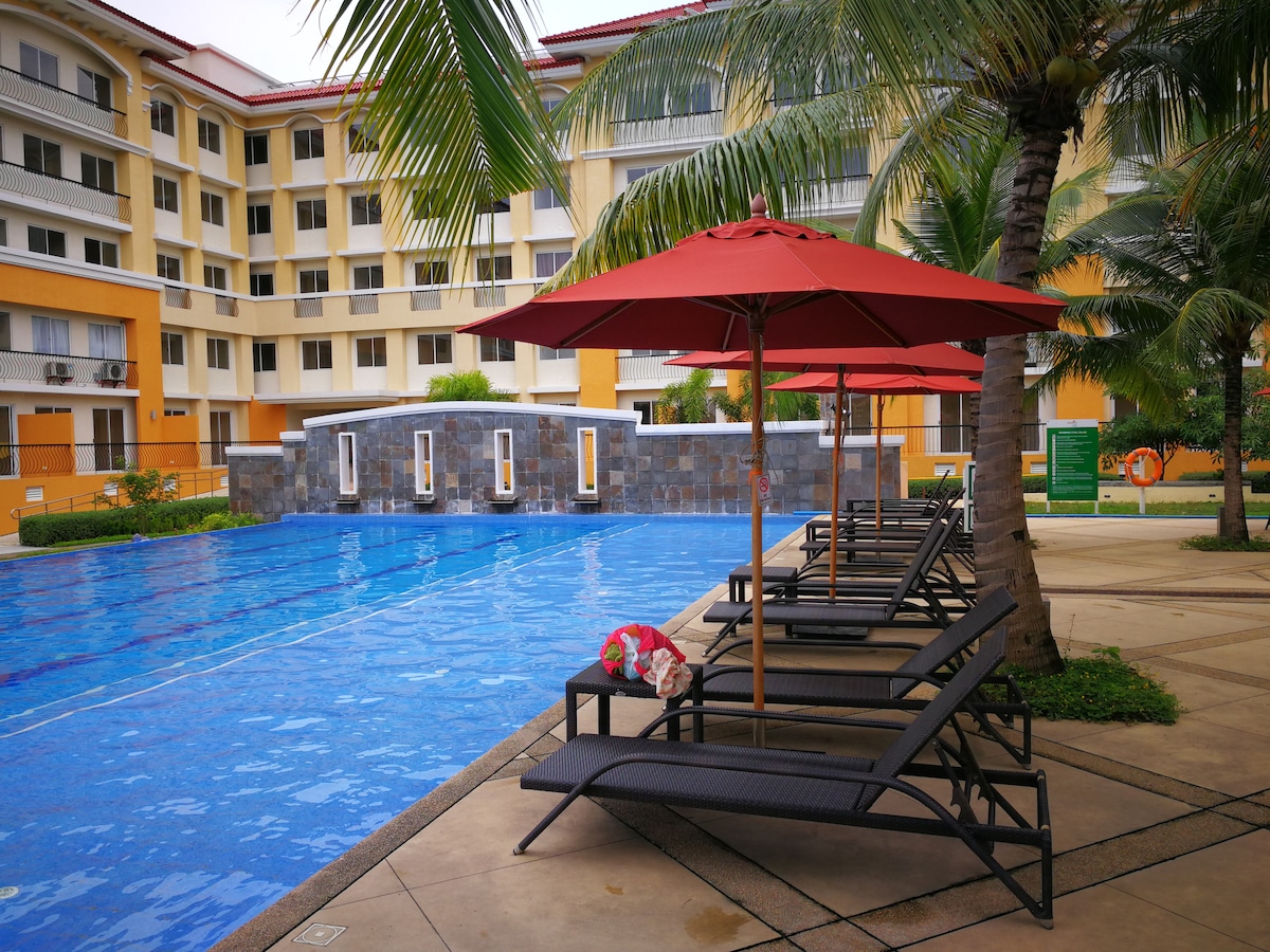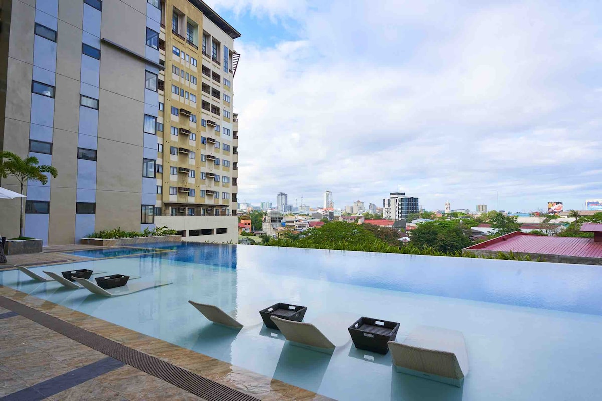 Cozy & relaxing fully furnished 2 bedroom resort living Condo apartment with great views, balconies, high speed WiFi, hot water shower, fully equippedkitchen facilities, clothes washing machine, access to swimming pools, gym, basketball court, children's playground and activity room at a great value close to SM Seaside Mall, restaurants at ElCorso and city centre.