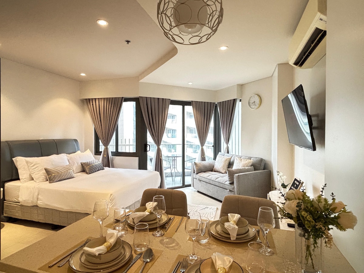 Welcome to your relaxing retreat in the heart of Tambuli Seaside Resort – the only residential resort in Cebu with direct beach access! This stylish studio is perfect for couples, digital nomads, or solo travelers looking for comfort, convenience, and coastal charm. Enjoy a Queen-size bed, coffee machine, Netflix, 500 Mbps WiFi, a full kitchen and a peaceful balcony with a garden view. Whether you're working remotely or just unwinding, this cozy space has you covered.