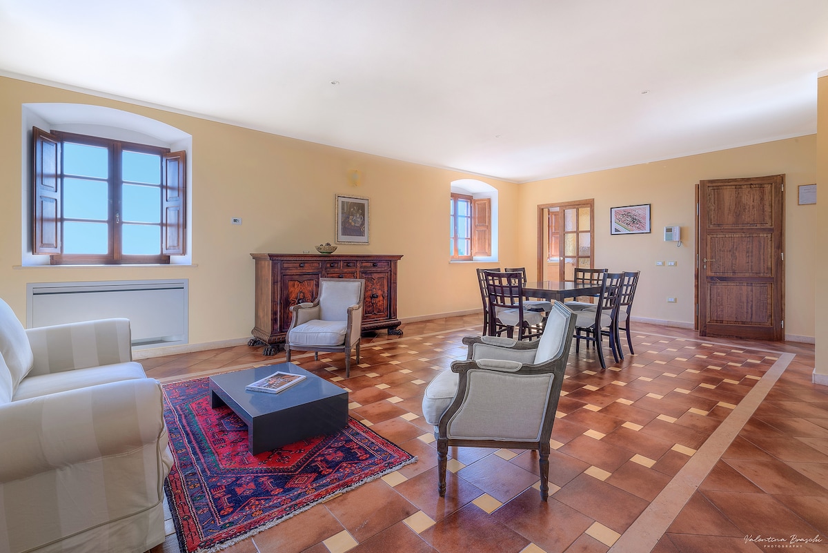 Immagina di svegliarti con le colline ornate di borghi e campanili a perdita d'occhio oltre la finestra della camera da letto: un'alcova con soffitti spioventi, travi e travicelli, pavimento in legno, in cima ad un antico casolare. Immagina da ogni affaccio della casa il sole che splende sulle vigne, oppure immagina il verde acceso degli uliveti dopo la pioggia primaverile oltre la grande terrazza adiacente alla cucina.