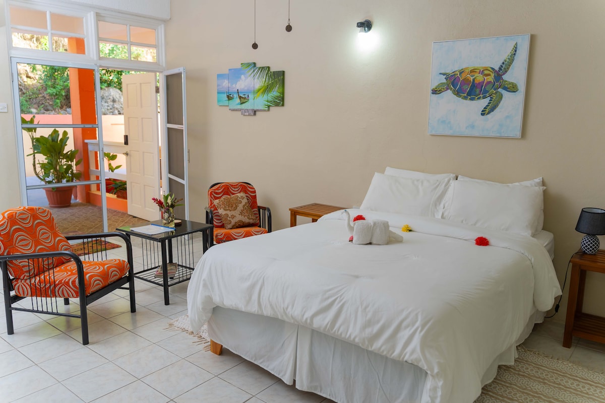Clean & simple rooms with air-co, 2 single beds or 1 double, private toilet & shower. Located right on Sandy Beach in the deep south of the island. Swim, sunbathe, hike in the rain forest, ride horses, climbs the Pitons or chill. Wind- and kitesurfing and wingfoil in the winter months. The Reef restaurant is open 6 days per week (8 am - 6 pm) with breakfast, cocktails, cold beers, milkshakes, creole & international menu. TripAdvisor Hall of Fame. US$66 for single occupancy, US$76 for double