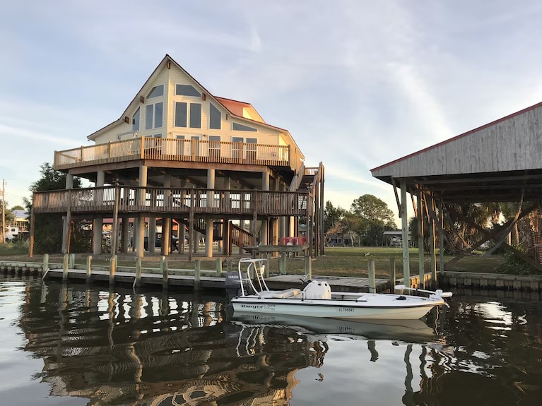 Fish, boat and relax on your own private island! Accessible by boat only with a quarter mile of shoreline overlooking the Gulf of Mexico! YES theres power YES there’s wifi! The main house is 2800 sf accommodating 13 people. There is also a bungalow on the property that sleeps up to 4. Bring up to 3 boats & make use of multiple docks, huge outdoor picnic area & outdoor kitchen as well as a fish cleaning station. Cook & eat your catch while watching manatees and dolphins swim in your front yard