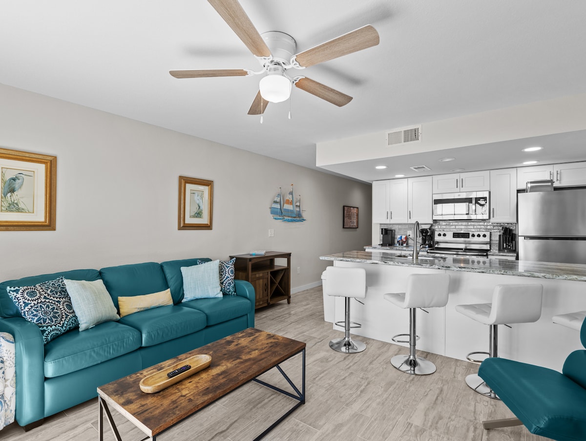 SEAHORSE LANDING #503 This beautifully decorated third-floor corner unit offers the perfect elevation — high enough for breathtaking views, yet low enough to feel connected to the shoreline below. As a corner unit, it provides additional space and panoramic views of both the Gulf and the coastline. From the kitchen and living room, enjoy unobstructed, direct views of the Gulf of Mexico. Spectacular sunsets can be savored from inside the condo or from the private wrap-around balcony.