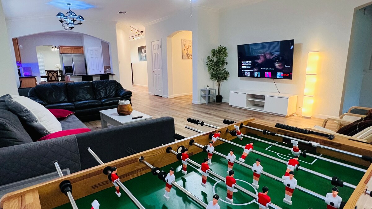 Bring the whole family to this modern living place with lots of room for fun; explore the rich life in central Cedar Park with minutes away access to all sorts of activities. Massive 2000 sqft of space with 3 bedrooms and 2 full bathrooms are all for you: 65" TV with free Netflix, high speed WiFi, foosball table, game table, convertible sofa bed, illuminated countertop, huge and quiet backyard... minutes away from shopping malls, and close to Tesla supercharger.