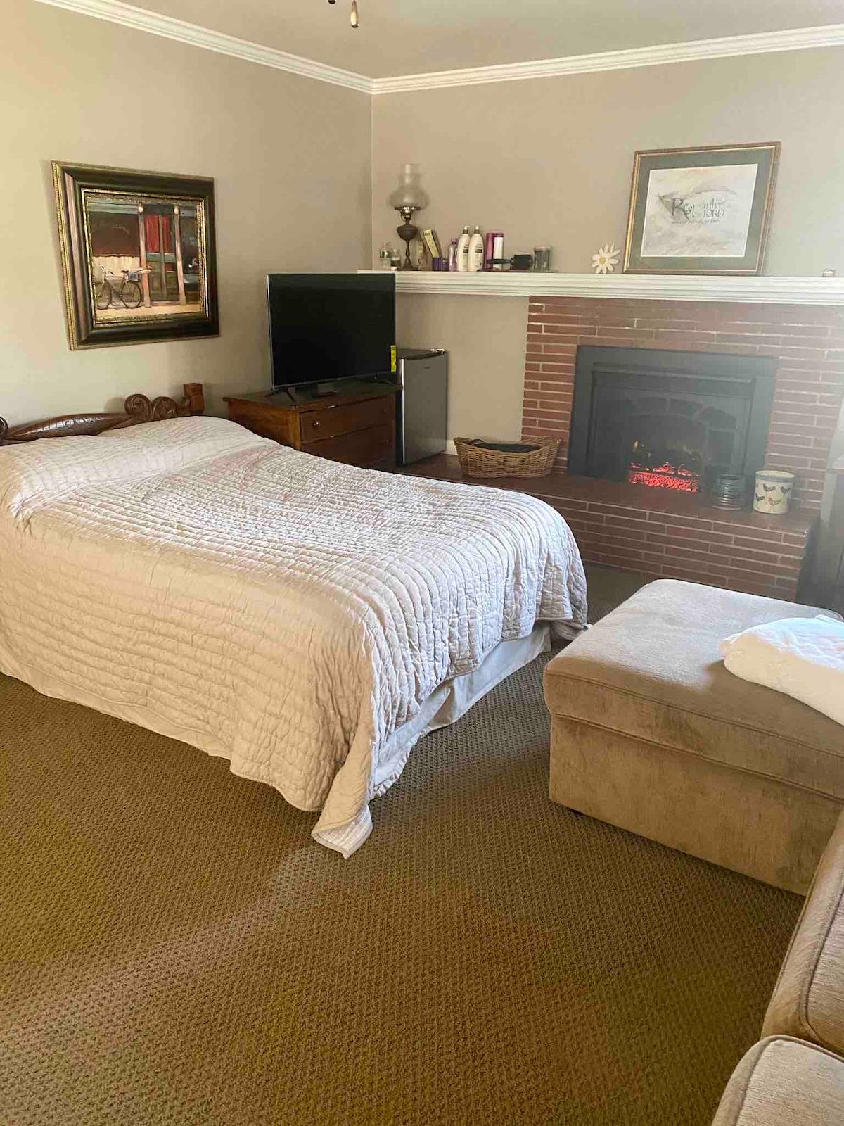 This is a nice,clean ranch in a safe location in east Cedar Rapids, 10 min from downtown. This is a larger room with a full bed, couch, desk/table, small refrigerator, 32” smart tv, internet, fireplace and a private entrance. You are welcome to use the bathrooms, kitchen, front & back porches. We live here and do have a cat. We offer 10% discount on weekly stays & 30% discount on monthly stays! Let us know if you want to bring a pet or service animal. before you book. Park in the street please.