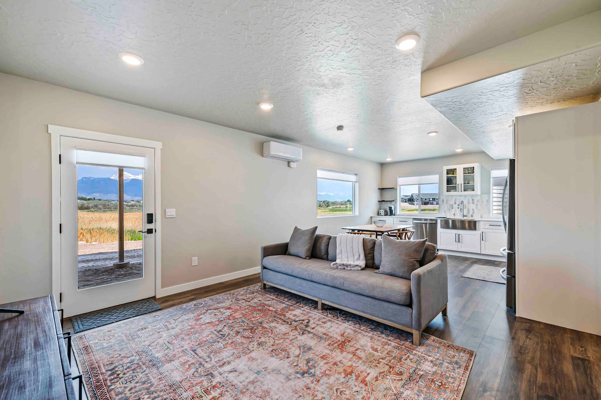 Welcome to your Luxury Mountain View Suite! Enjoy stunning mountain views and privacy in this spacious 800-sq.-ft. newly-built, peaceful, and centrally located guesthouse. This beautiful country setting is close to Salt Lake City, renowned ski slopes, and many gorgeous hiking trails. Unwind after a busy day at work or a day on the slopes by preparing a meal in the well-stocked kitchen, relaxing in the spa-like bathroom with the luxurious two-person tub, or lounging in the cozy king-size bed.