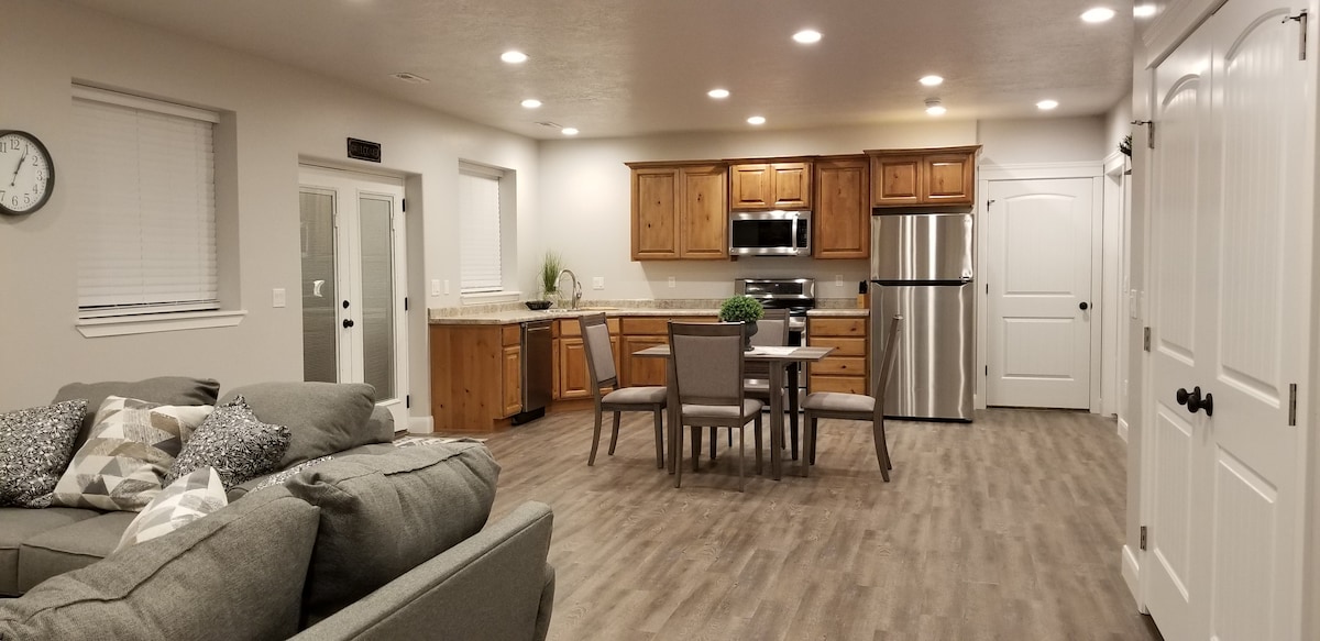 Newly remodeled, private, basement apartment with separate entrance. Our space is a large studio apartment with a full size kitchen, washer and dryer for your private use. ** Please note that above the apartment is the hosts kitchen area. With a family of 7 living in the house there can be a fair amount of foot traffic and noise.** Approx. 15 min. from SLC airport, 37 min.Snowbird, 27 min. to downtown Salt Lake. This rental requires that tenants can safely get down stairs.