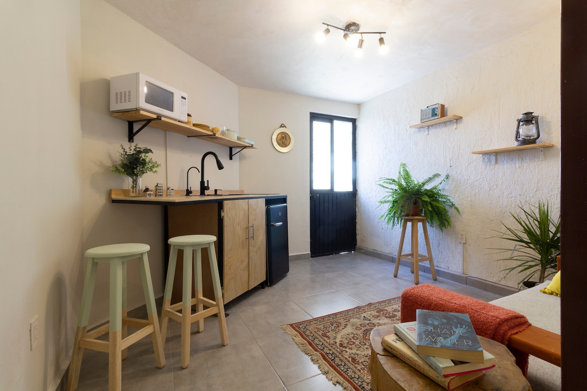 🌟 Loft privado y acogedor 🔒 Privacidad total: entrada independiente, no se comparte con nadie. 🚗 Cochera para un auto y espacio decorado con buen gusto, con recibidor acogedor y luminoso. 🍳 Cocineta con refrigerador compacto, microondas y todo lo necesario, Televisión en habitación. 📍 A 15 min del centro, con acceso rápido a las principales salidas hacia Querétaro, San Miguel de Allende, León, Guanajuato y CDMX. 🛒 Cerca de tiendas, supermercados, gimnasios y transporte.