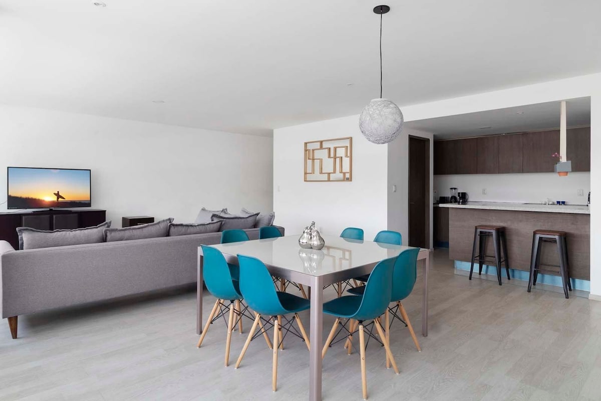 INDISPENSABLE ANTES DE RESERVAR CHECAR DISPONIBILIDAD CON EL ANFITRIÓN. La decoración es moderna, son departamentos de lujo amueblados y equipados muy cómodos para que te sientas como en casa. Tienen mucha iluminación y cuentan con dos terrazas cada departamento. Todos los servicios están incluidos ademas de servicio de limpieza de lunes a sábado,