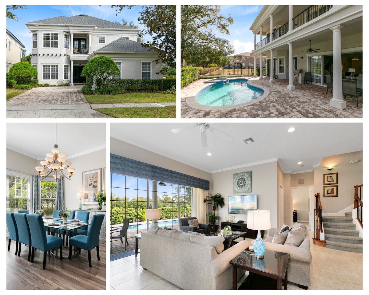 Stylish Design, Luxurious Comfort & Endless Entertainment, with a sprawling 2200 ft2 southwest facing pool deck & outdoor kitchen, no rear neighbors on a beautiful forest in the stunning 3.5 square mile Reunion Resort. You will have your own private pool with overflow spa, movie room, billiards - game room, 4 theme rooms: OUTER SPACE, MARVEL SUPERHEROES with a TUBE SLIDE, FROZEN II, HARRY POTTER CUPBOARD, PS5, within minutes to Disney.