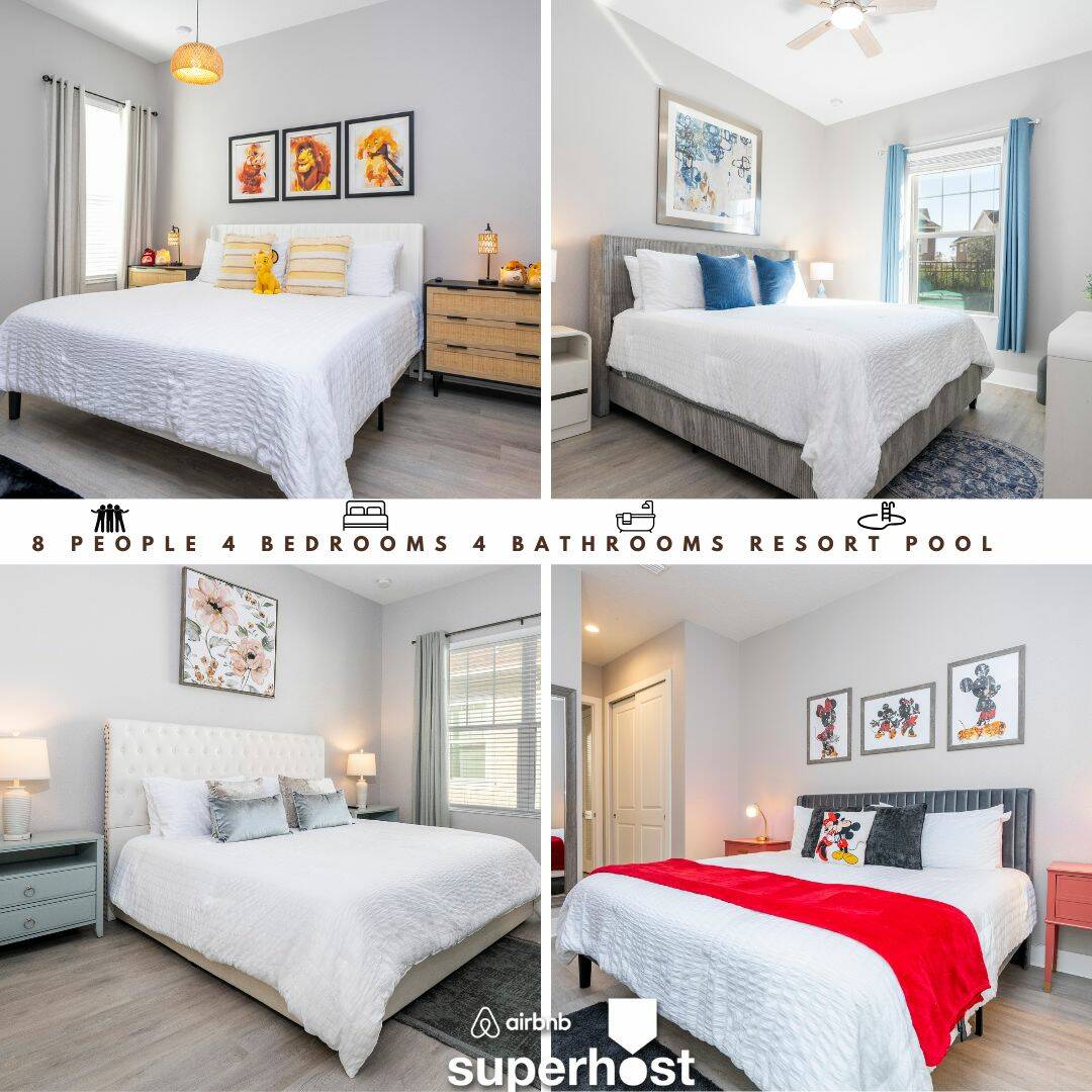 5 miles to Walt Disney World, Park your car in garage. Single story 4 bedrooms and 2 bathrooms with a private pool. Full equipped kitchen, Kids utensils, *TWO* Disney themed rooms for kids. stunning decorations and countless amenities. Fully equipped for BABY PacknPlay, STROLLER, HIGH CHAIR, even a Wheelchair and a walker for seniors! Everything you can't bring any bulky, we got you covered.