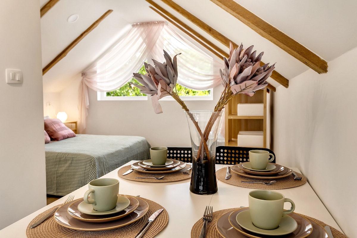 Cosy and comfortable cottage offers a modern and well-equipped kitchen. In the garden there is hot tub, sauna, a fireplace and a BBQ, where you can prepare food and enjoy the memorable sunsets. The charming interior of the cottage is a combination of wood, glass and stone. The retreat at the cottage Sončni Grič embraced by vineyards, forest and warbling birds will connect you with the nature and her healing powers. The Sončni Grič is located just a step away from highway exit Trebnje East.