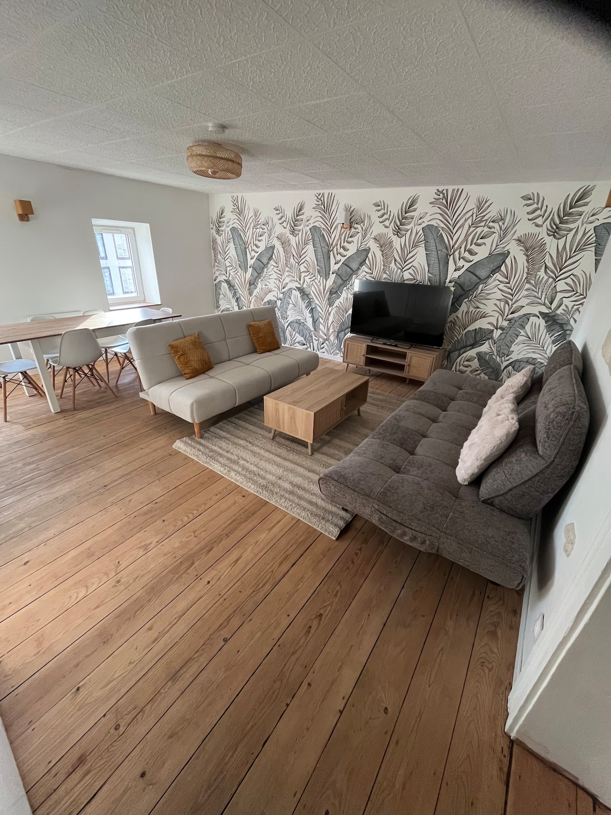 Profitez d'un logement au centre ville de Raon L' Etape. Appartement lumineux et chaleureux situé au 1er étage composé : - d'une cuisine équipée avec four, lave vaisselle, micro ondes, frigo, plaque vitrocéramique, bouilloire électrique et cafetière. - d'un coin repas. - d'une pièce à vivre avec un canapé et un lit de deux personnes (140 x 190) avec TV Orange et wifi. - d'une mezzanine avec deux lits d'une personne (90 x 190). - d'une salle de bain avec douche, sèche cheveux et lave linge.