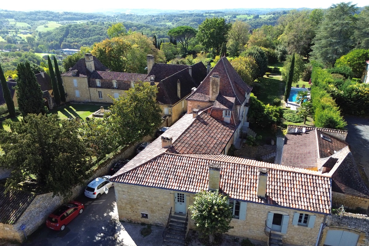 L'Ombrière is a beautiful 18th-century residence located 5 km from the medieval city of Sarlat, and is 200 m from the tremendous Château de Montfort , which is also a fascinating village in the Dordogne valley. Beautiful panoramic views of the Dordogne Valley and close to the river and its swimming spots. Perfect starting point for visiting all the touristic sites of the region. 4 lovely bedrooms, each with an en-suite bathroom and private toilet. The 2 attic rooms are equipped with AC.