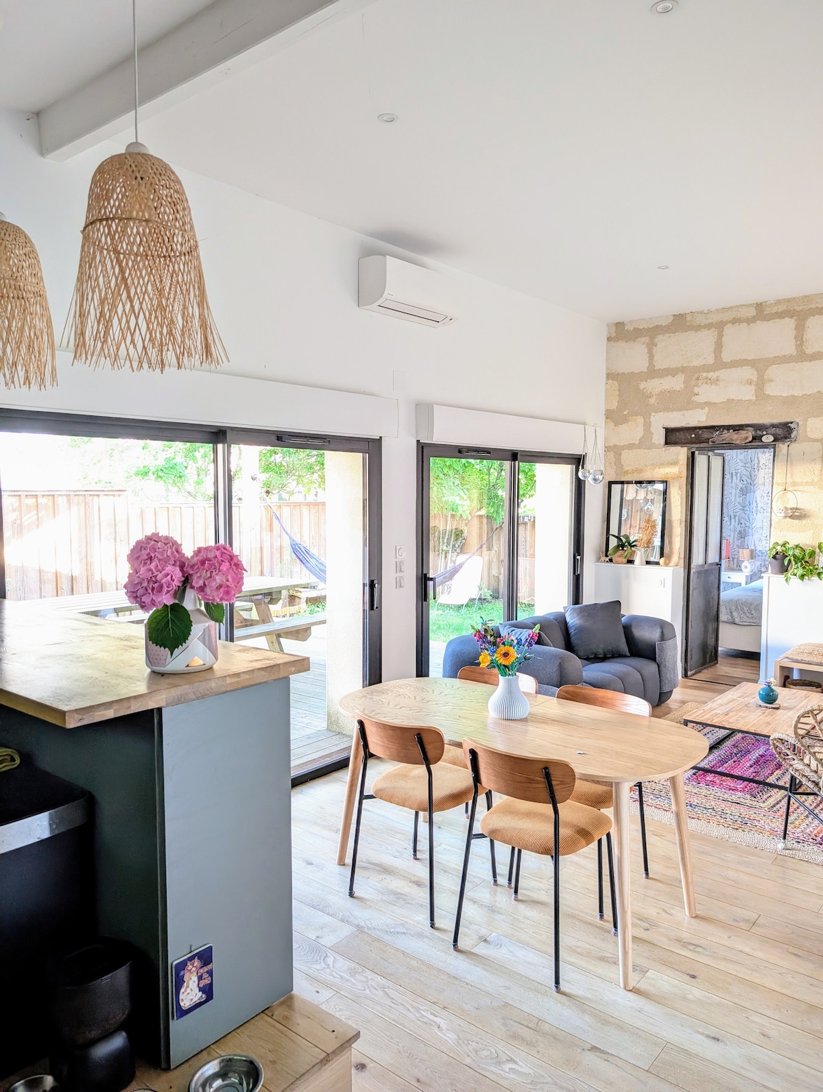 A 15 minutes du centre de Bordeaux, dans un environnement calme et verdoyant, maison (dépendance) de 42m^2 dans un style chaleureux et contemporain. La maison comprend une chambre avec lit double, une salle d'eau et un salon/salle à manger doté d'un couchage supplémentaire (canapé lit convertible). Vous pourrez profiter de la piscine aux beaux jours. Afin de respecter la tranquillité du voisinage, les fêtes sont interdites. La capacité maximale est de 4 personnes.