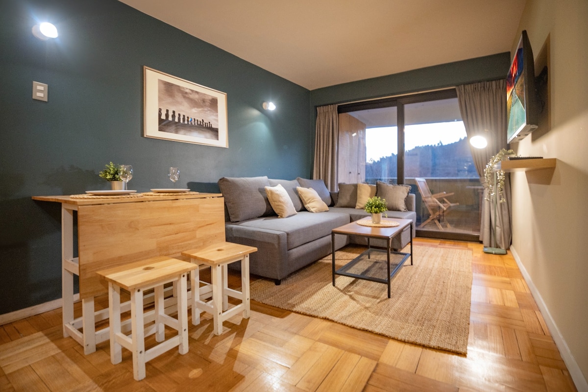 It is a one-bedroom apartment with parking in downtown Providencia. Close to many shopping places, walking distance to Metro (1 block away), restaurants, and more. If you come to work, the internet is super fast, amenities are great, and you will have an awesome view of the San Cristobal Hill from the super big apartment's balcony and the rooftop.
