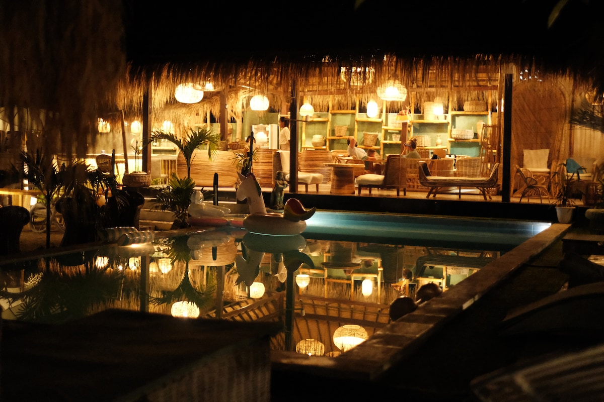 One of our most sought-after rooms, this dreamy 1-bedroom features a king bed, semi open-air ensuite, private balcony, and outdoor living space. Located opposite the pool, it offers resort pool views and a glimpse of the ocean. Designed with flair and authenticity, it’s set on the most peaceful side of Nusa Lembongan—just a 3-minute walk to two beaches : Coconut and Tamarind beach. Daily breakfast included at on-site plant based restaurant The Playful Table.
