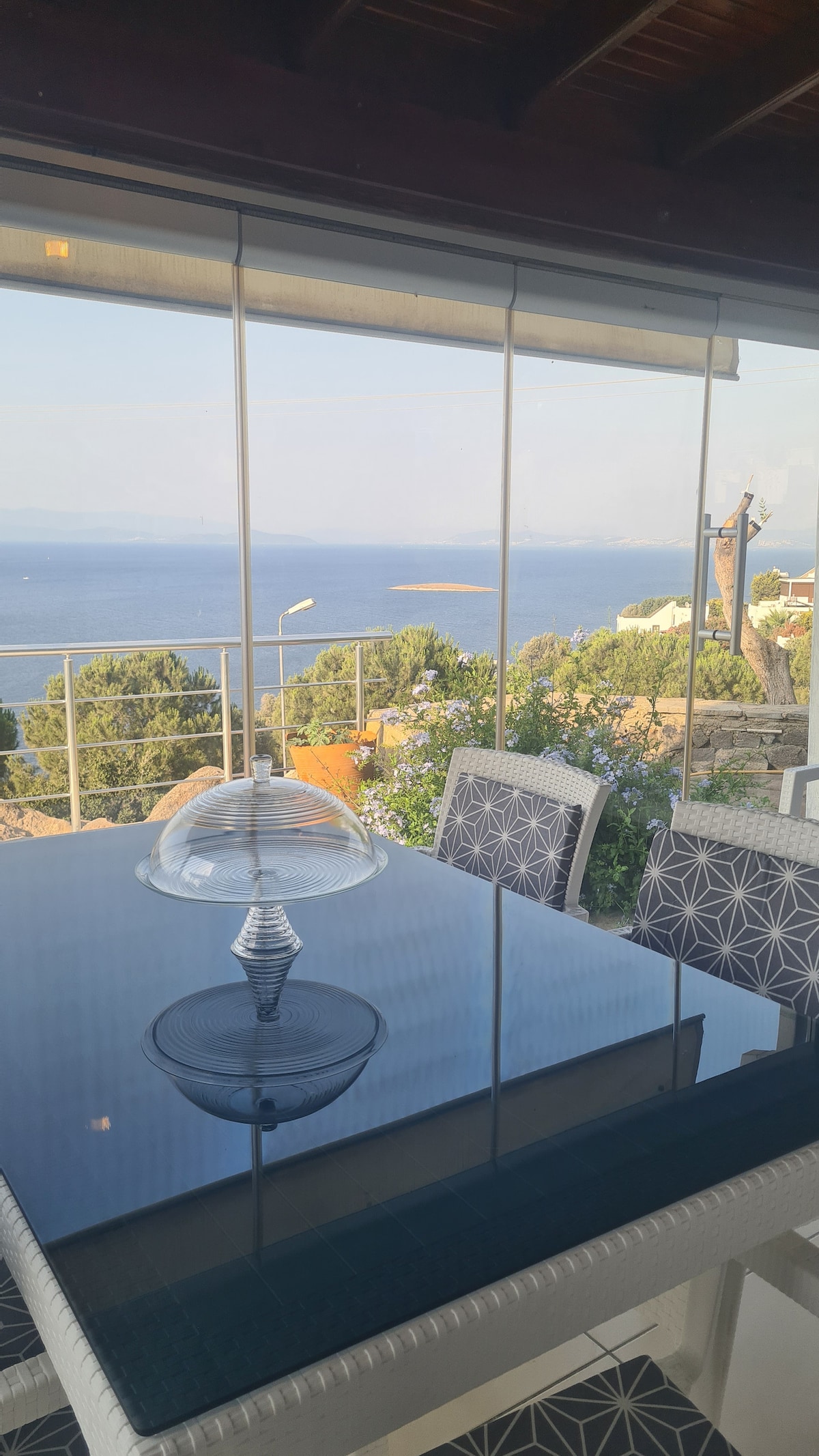 Our holiday home in the peaceful and prestigious Hekimköy complex with 2 private beaches in Türkbükü offers an ideal retreat for a relaxing vacation. Located approximately 200 meters from the sea, the house features a spacious terrace with panoramic views of the Aegean Sea through olive trees and colorful oleanders. The house accommodates up to 6 guests, offering three bedrooms, two bathrooms, and an open-plan kitchen combined with a comfortable living area.