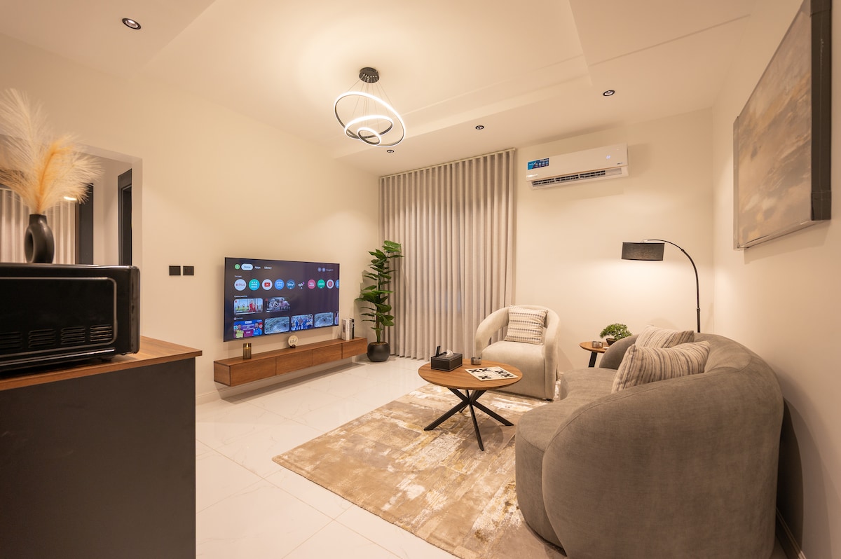 Step into comfort and style in this spacious 1-BR with a huge living room and elegant design. The bedroom features a king-size bed with stunning curtains, ensuring both comfort and privacy. Relax in front of the 65-inch 4K Smart TV, with a minibar, equipped with all essentials Located on King Fahad Road, the apartment is just minutes from the airport, Mall of Arabia, and the city best events. With private parking, smart-entry lock, and a fast 5G WiFi, your stay is as seamless as it is stylish.