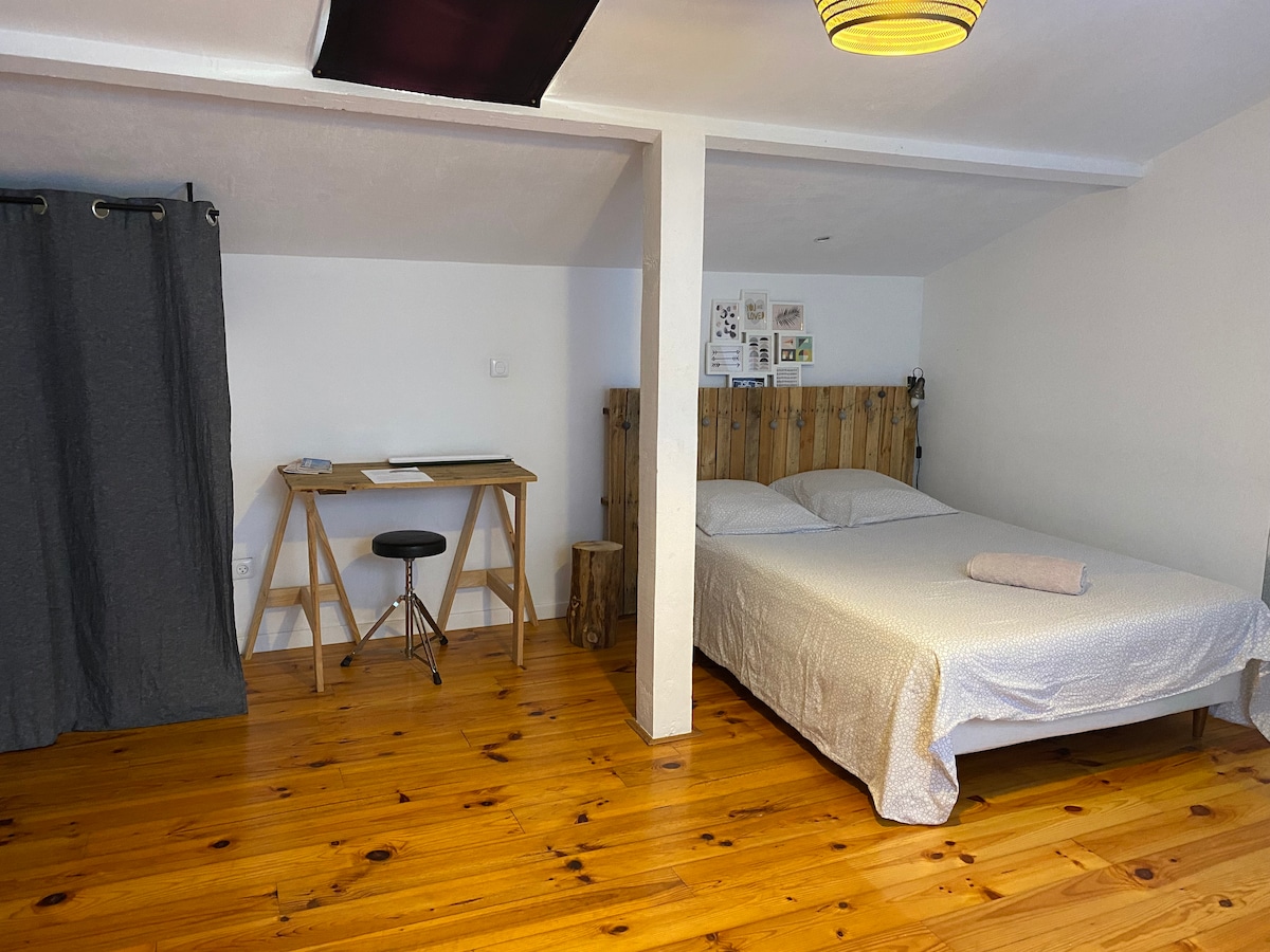 Mini studio de 17 m2 attenant à la maison. Entrée indépendante par le garage. Douche, wc et coin cuisine privatifs. jardin ensoleillé. Rue très calme. A pied : 10 min du tram, 15 min du rocher de palmer. En voiture : 3 min de la rocade, 15 min du stade, du parc des expositions, de l'aréna, de la cité mondiale du vin, de Bordeaux centre.