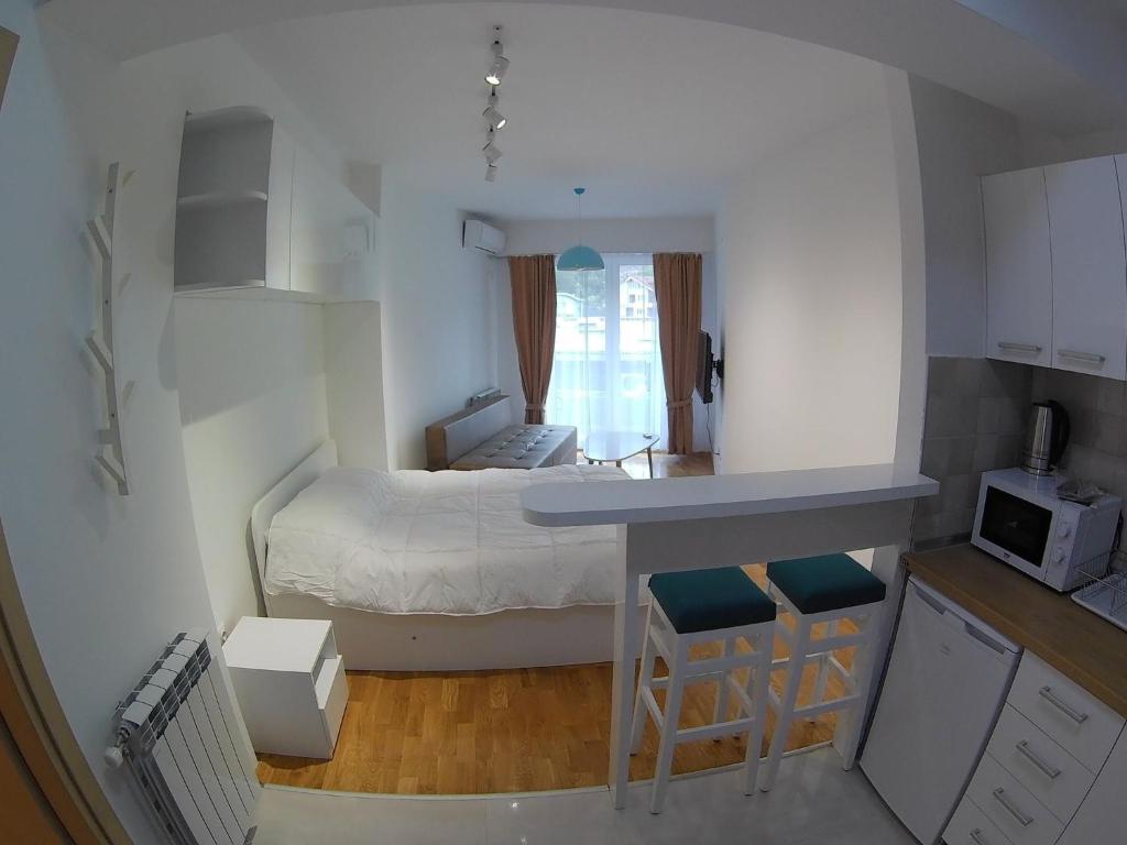 Fully renovated private modern apartment in the city centre, in the Kapishtec neighbourhood. Only 10 minute walk from main city square. Ideal for couples, group of friends or families. Located on the 9th floor, next to a shopping mall, where you can find lots of restaurants, coffee shops, bars, market. Bus stops and taxi station located in front of the building. Parking available in front of the building. Lovely views of the surrounding area. Nice, quiet and cozy.