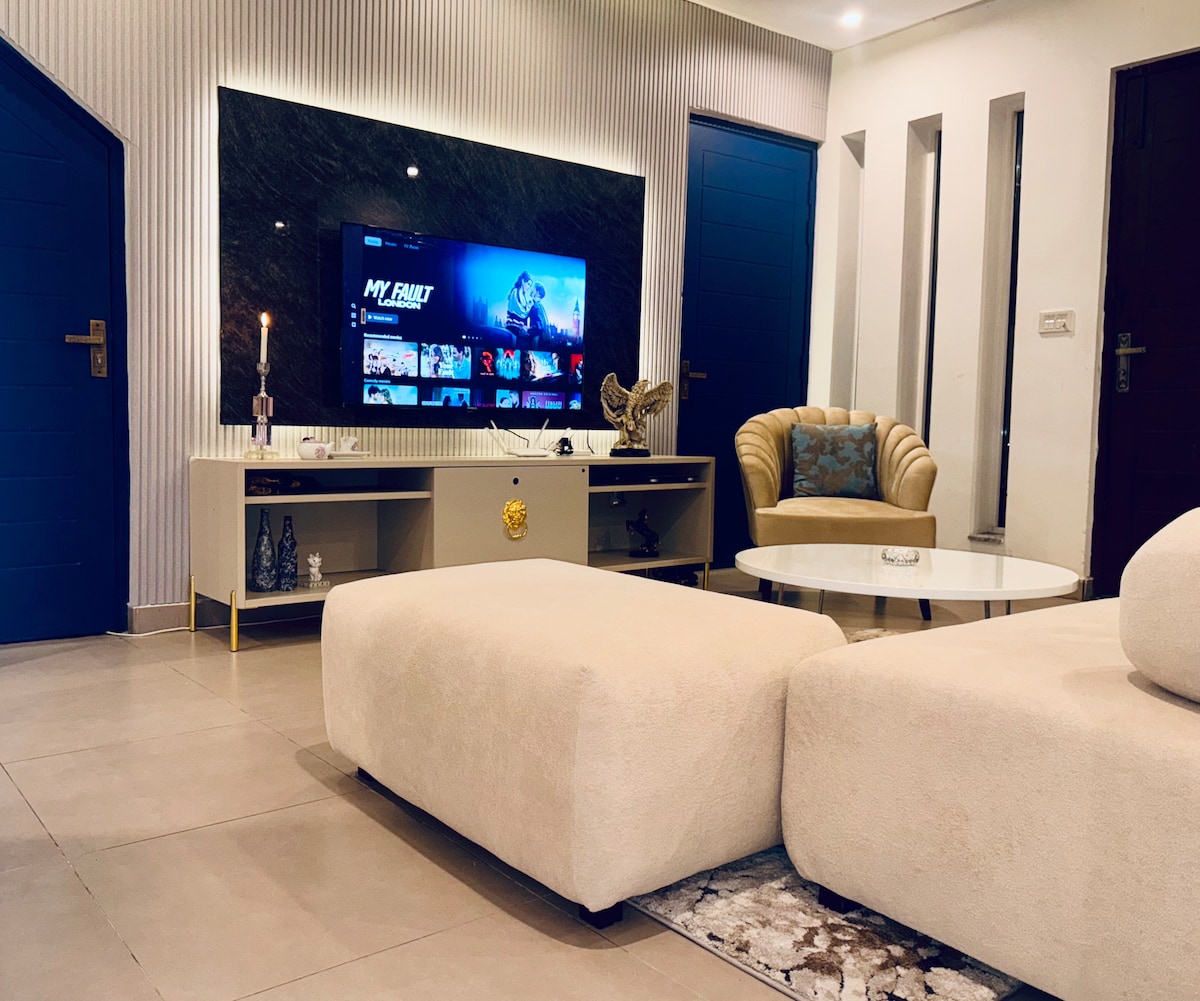 Luxury 2BHK in SkyPark One | Designer Living with Breathtaking Views Step into comfort in this spacious designer apartment overlooking Islamabad’s serene hills. Enjoy 2 king beds, private balconies, 65" Smart TV, ultra high-speed WiFi and full kitchen. Located above SkyPark One Food Court, 2 mins from Expressway. Perfect for families or business travellers. Modern decor, smart locks, inverter ACs & hot water ensure a cozy stay. CNIC required for guests 18+. No smoking or parties. Book now!