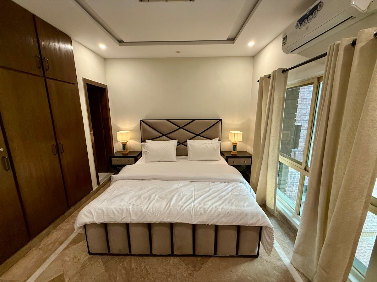 Enjoy a stylish lavish one bedroom corner apartment having margalla mountains and faisal masque view at the centrally-located place Centarurs mall in the heart of Islamabad F-8 Facilities , and services Airport pick and drop available Wifi Netflix Youtube Hot/cool water Jacuzzi hot tube Open outside mall parking lot Shared swimming pool with charges