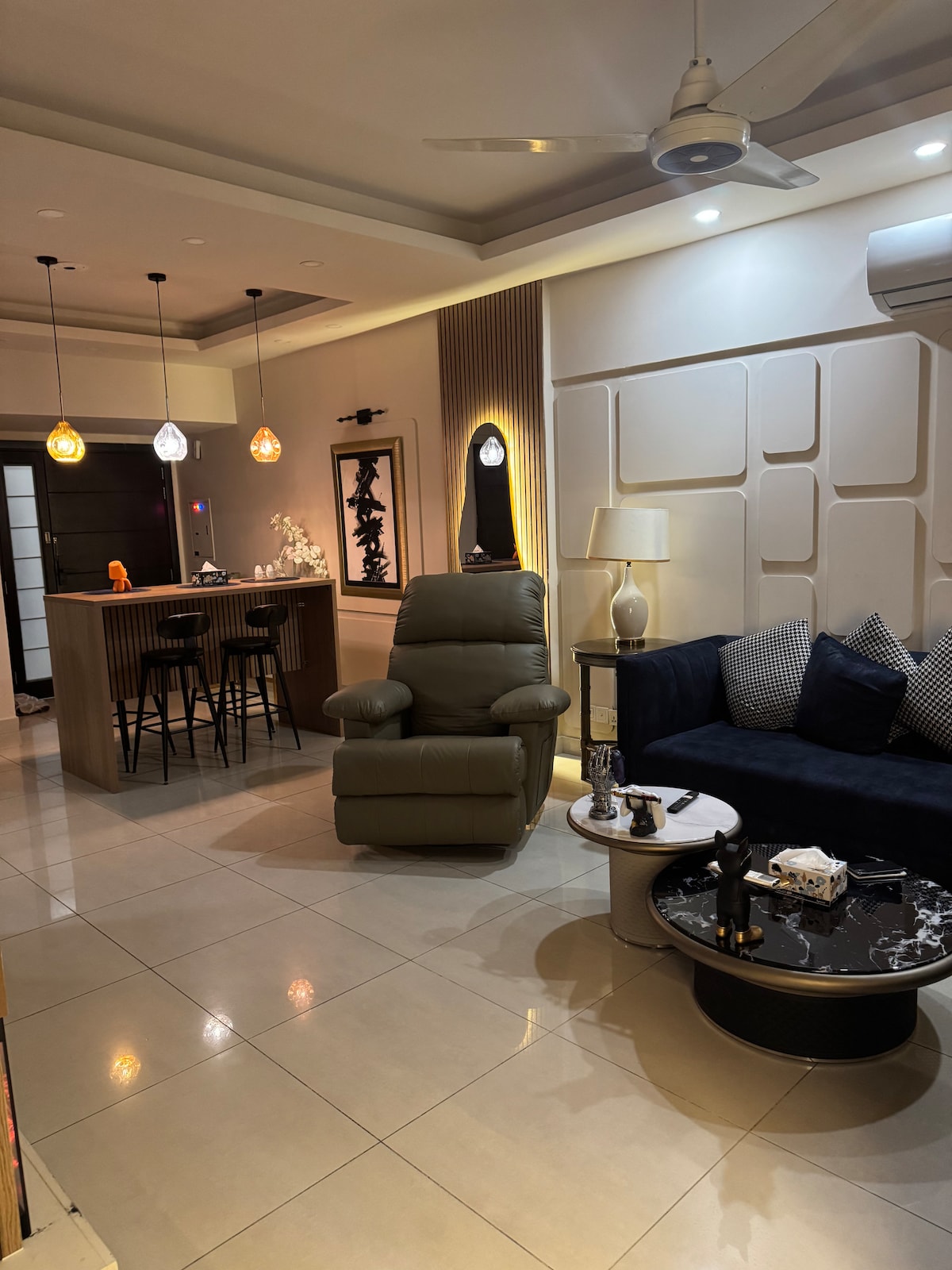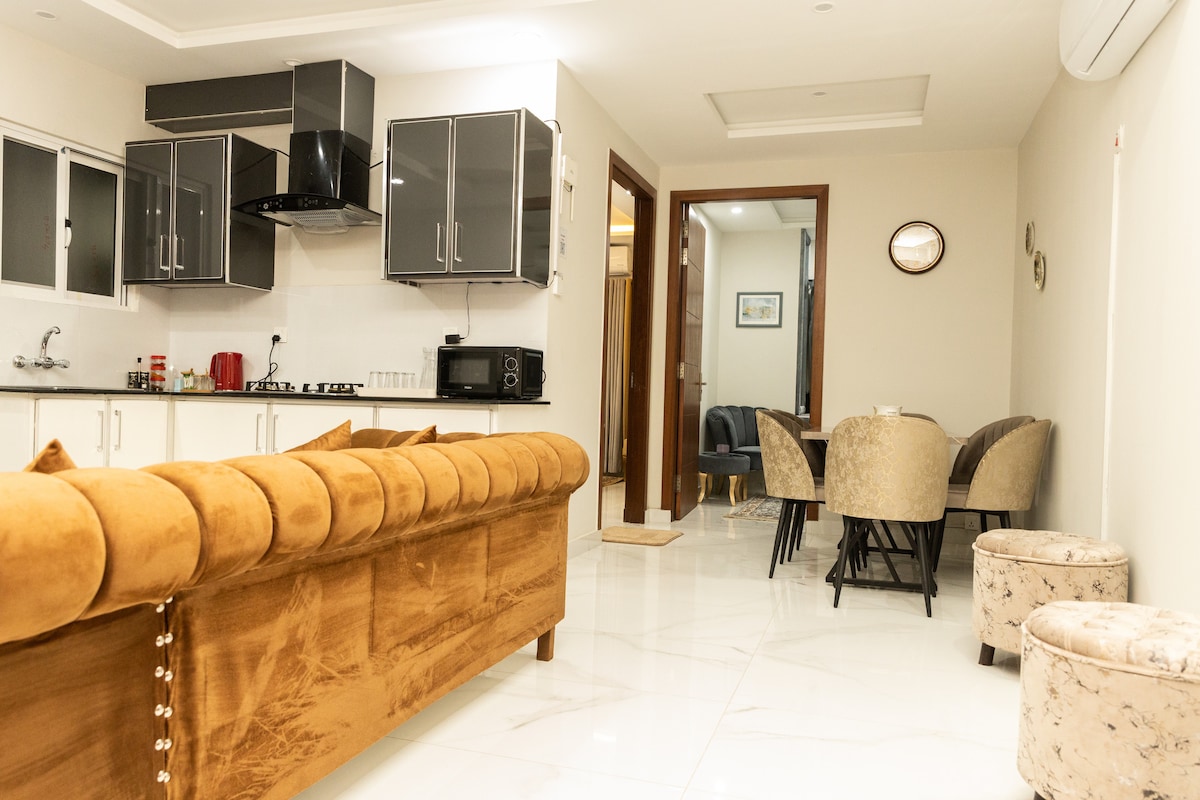Luxury 2BHK in SkyPark One | Designer Living with Breathtaking Views Step into comfort in this spacious designer apartment overlooking Islamabad’s serene hills. Enjoy 2 king beds, private balconies, 65" Smart TV, ultra high-speed WiFi and full kitchen. Located above SkyPark One Food Court, 2 mins from Expressway. Perfect for families or business travellers. Modern decor, smart locks, inverter ACs & hot water ensure a cozy stay. CNIC required for guests 18+. No smoking or parties. Book now!