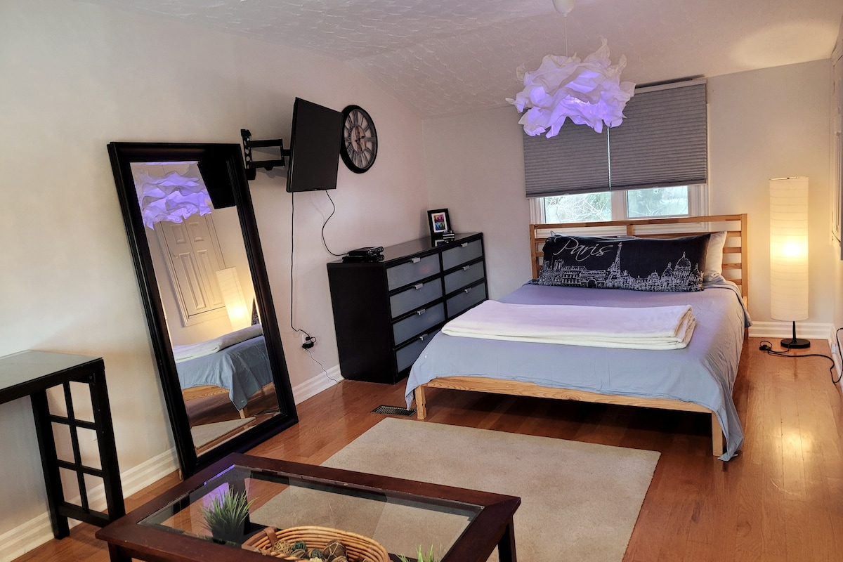 Welcome to this cozy bachelor suite — a smartly designed space perfect for solo travelers or couples. Rest easy on a luxurious king-size bed and enjoy the convenience of a well-equipped kitchenette and in-unit laundry. Located just 10 minutes from Pearson Airport and 20 minutes to downtown Toronto, it’s an ideal base for work or leisure. A private entrance and thoughtful layout ensure a comfortable, independent stay.