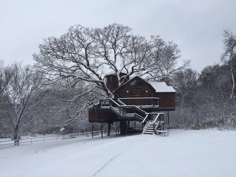 Perched high in the majestic arms of a 150 year old Burr White Oak tree. This cozy 1200 square foot, seven-room house not only has breathtaking views it also has enchanting and delightful surprises befitting of a fairytale. Climb 40 feet up onto the Observation Tower, where a telescope waits for you, ready to scan the night sky, and reveal the panorama of the heavens -- overlooking 500 acres of natural splendor right next door. Step into the hot, bubbling jets of the jacuzzi, or warm caress of the rain shower, and restore your spirits by soothing your muscles, melting away any residual tensions of the day. Get a restful sleep in one of our soft beds. In the morning, pad around on in-floor radiant heated floors (so cozy during winter-time.) Or enjoy your morning coffee on one of four outside decks. And don’t forget to solve the mystery of the Treehouse, that awaits your discovery within its wood beamed walls. This treehouse was custom designed by its architect with three dimensional chess in mind. Artisan architectural details are found throughout. Crystal chandeliers bedeck its high ceilings, and marble countertops grace the elegant, fully appointed kitchen. (A surround sound system helps set the mood for those special dinners in the dining nook.) One of two fireplaces adds luxurious touches to the primary bedroom with a queen bed, and hideaway bed in the secret room, along with a jacuzzi and rain shower in the primary bath, as well as a second bathroom in the secret room. Perfect for honeymooners, couples, business/corporate overnights, solo travelers and families with children over twelve years old. These are only a few of the many luxury details in this spectacular vacation spot must-see. Spend your days snuggled up beside the fireplace of your choice, while enjoying the panoramic views. You can stream your favorite movies and shows with Broadband Wi-Fi throughout the house. Come down for a leisurely walk around the grounds, and stop by to visit and feed the goats and chickens that call Hope Glen Farm their home in the corral of this historic farmstead. Bring your stress levels down and your heart rate up by walking over to Washington County Cottage Grove Park Reserve, just steps away, and answer its call to explore over 550 acres of fields and forests. Go hiking and biking down its trails, geocaching the hills and ravines for hidden treasures, or spend the afternoon fishing and kayaking in the lakes. And don’t let cooler temperatures keep you from discovering the pristine natural beauty of winter! Winter activities include cross country skiing and snowshoeing on the blankets of snow. Breathe deeply of the crisp Minnesota winter air -- truly one of life’s great pleasures. Plus, only a ten minute drive brings you to nearby Afton Alps in Afton State Park offering downhill skiing and snowboarding. For clarity, the Treehouse has 2 private bedrooms: Bedroom 1 is has a queen bed. Bedroom 2 has a bedroom with standard sofa bed with attached half bathroom, which is the secret room a must find. Give yourself the gift of this luxurious enchanting TreeHouse Suite in the treetops, for a enchanting vacation experience you'll never forget. Something to write home about!