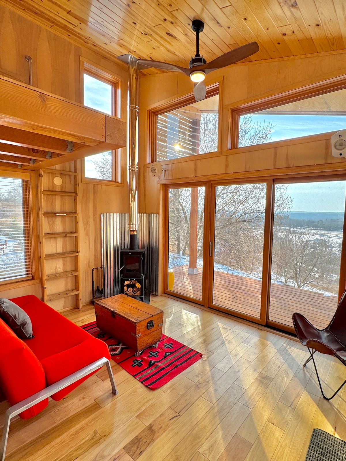 Experience our custom-built eco-friendly tiny home perched on the top of the ridge above the majestic St Croix River Valley. Enjoy expansive views from the deck, loft or many windows looking over the valley. Enjoy our private barrel-sauna, fire-pit, gas grill, pond with canoes and kayak or Wolf Creek with a private crystal-clear swimming hole! Or just chill on the ridge watching the many birds and wildlife. Just over an hour drive from the Twin Cities, a romantic and memorable stay awaits you!