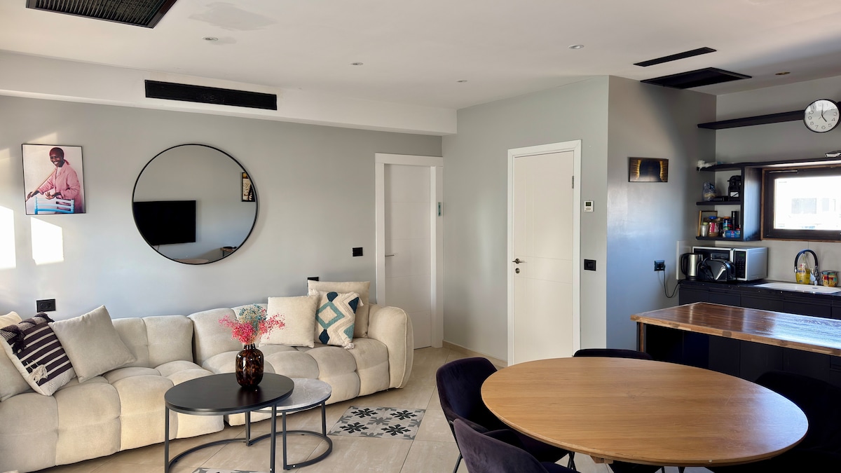 Bienvenue dans ce superbe duplex (au 6éme étage) composé d'une salle salon avec TV 65" , cuisine entièrement équipée, avec balcon avec table chaises pour profiter du soleil, des repas en famille et de la vue panoramique sur Tel Aviv. 2 chambres parentales, lits king size, 2 salles de bain/ douche L'escalier dessert la chambre parentale à l'étage. Parking gratuit ATTENTION : vous aurez le droit d'utiliser la piscine et la salle de sport si votre réservation est égale ou supérieure à 10 jours.