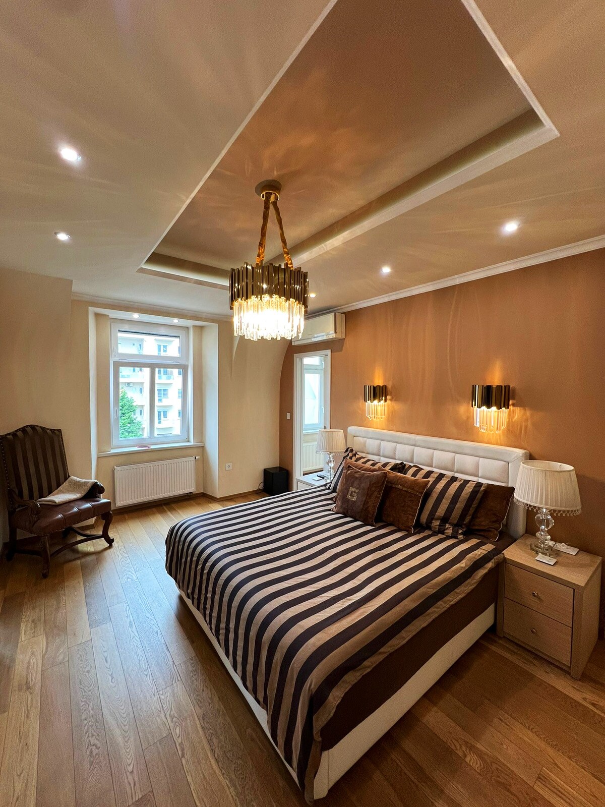 Situated on a great location – the Bavarian court, we are renting a 4 bedroom, deluxe, classical style residence (2nd floor), renovated in 2019. The bright residence offers views of the north towards the Kamnik-Savinja Alps, to the east towards Ljubljana Castle and the west, towards Tivoli City Park. The apartment combines luxurious classical furniture with latest modern design and amenities making each room comfortable and inviting.