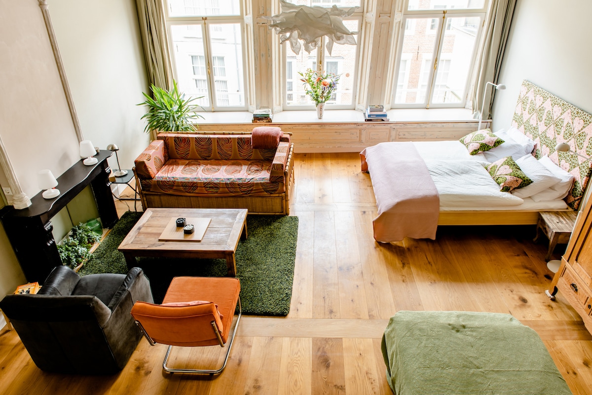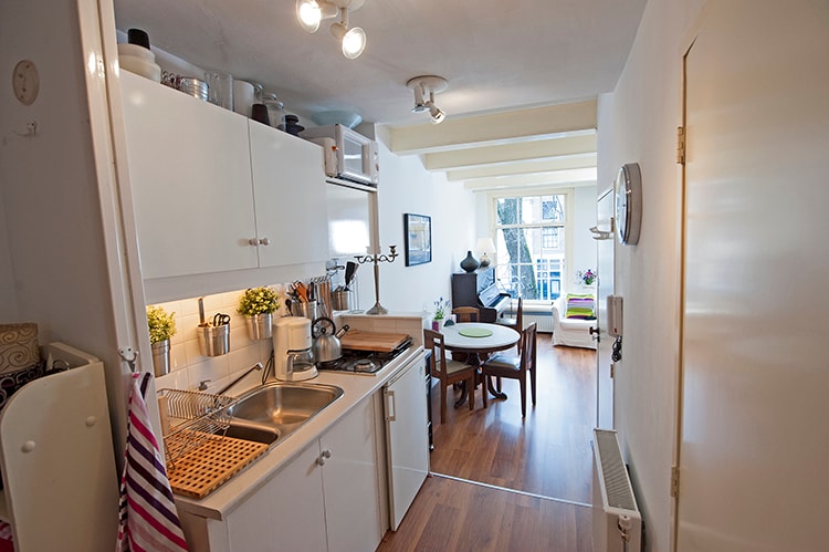 Studio Huis Roomolen is located at Roomolenstraat in the center of Amsterdam, a little street beween canals, yet; in the middle of things. Three large windows give a nice view over the Roomolenstraat. The size of the luxurious studio is 26m² including private kitchen, shower and toilet. Private roof terrace of 10m² at the backside enclosed by the neighbor buildings. The place is very warm and personal, perfectly suited for a single traveler or couple to retreat as well as to discover Amsterdam.
