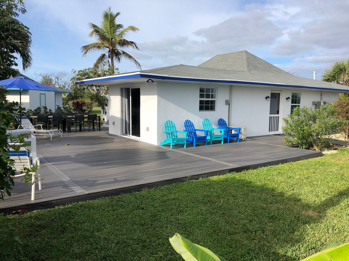 This newly rebuilt villa is just a two minute walk away from the white powdery sand and turquoise water of the world famous 3.5 mile Treasure Cay beach. This villa comes with 2 bedrooms one with a king bed and the second bedroom with two twin beds that can be converted to another king bed, 2 full bathrooms, fiber high speed internet (100/ 50), 3 SMART TV's with cable and great outdoor patio spaces with tables, lounge chairs and a BBQ. Relax and enjoy !! 5% weekly and 10% monthly discounts !!