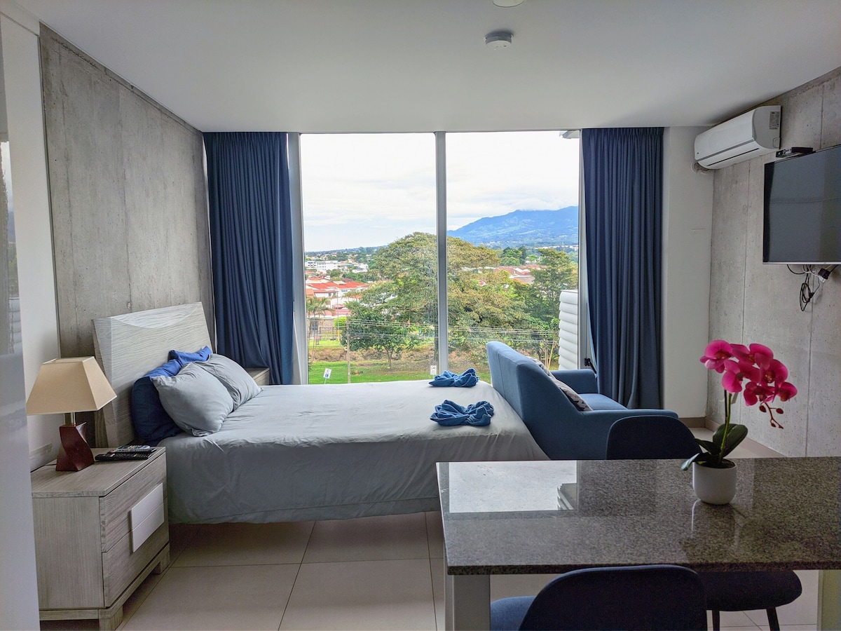 CR Stays Welcomes you to this fully-equipped studio just 4 miles from Juan Santamaría Airport. Enjoy breathtaking views of the Escazú mountains, a king bed, queen sofa bed, fast Wi-Fi, and air conditioning—ideal for 4 guests. The building boasts a gym, pool, BBQ terrace, private cinema, and meeting rooms. Minutes from Plaza Real Cariari’s shops and restaurants, and located in a prime business hub. 24/7 security for a safe, stylish, and comfortable stay.