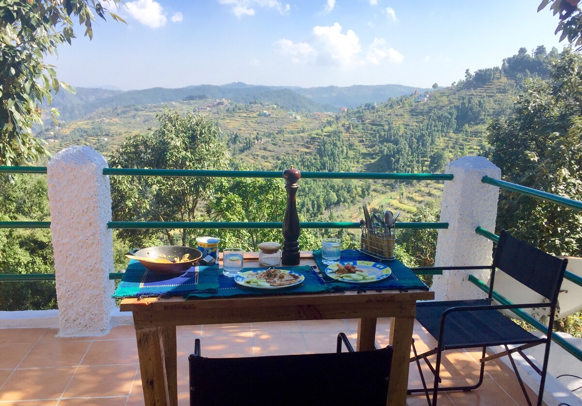 A luxury cottage well furnished and fully equipped, nestled in an Oak forest facing a valley in the Kumaon region of Mukteshwar in the Himalayas. It's an open layout with one private bedroom, and two open planned bedrooms and terraced gardens. The cottage has a covered Patio overlooking the valley. All rooms are bright as the cottage faces east! To maintain privacy, there is a railing assisted path leading down to the cottage!