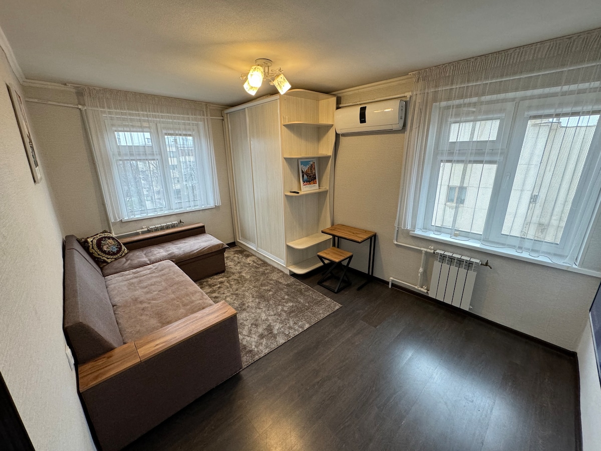 Have fun in our comfy and stylish place. Modern and functional studio in Almaty city for 2-4 people. Infants and children friendly. Newly refurbished entire place has everything you need for your convenient stay. The apartment has fully equipped kitchen, Wi-Fi and all needed amenities. The apartment is located next to the big shopping mall with an array of restaurants, cafes, with supermarket. The main City Walking street is in 10 minutes by walk.