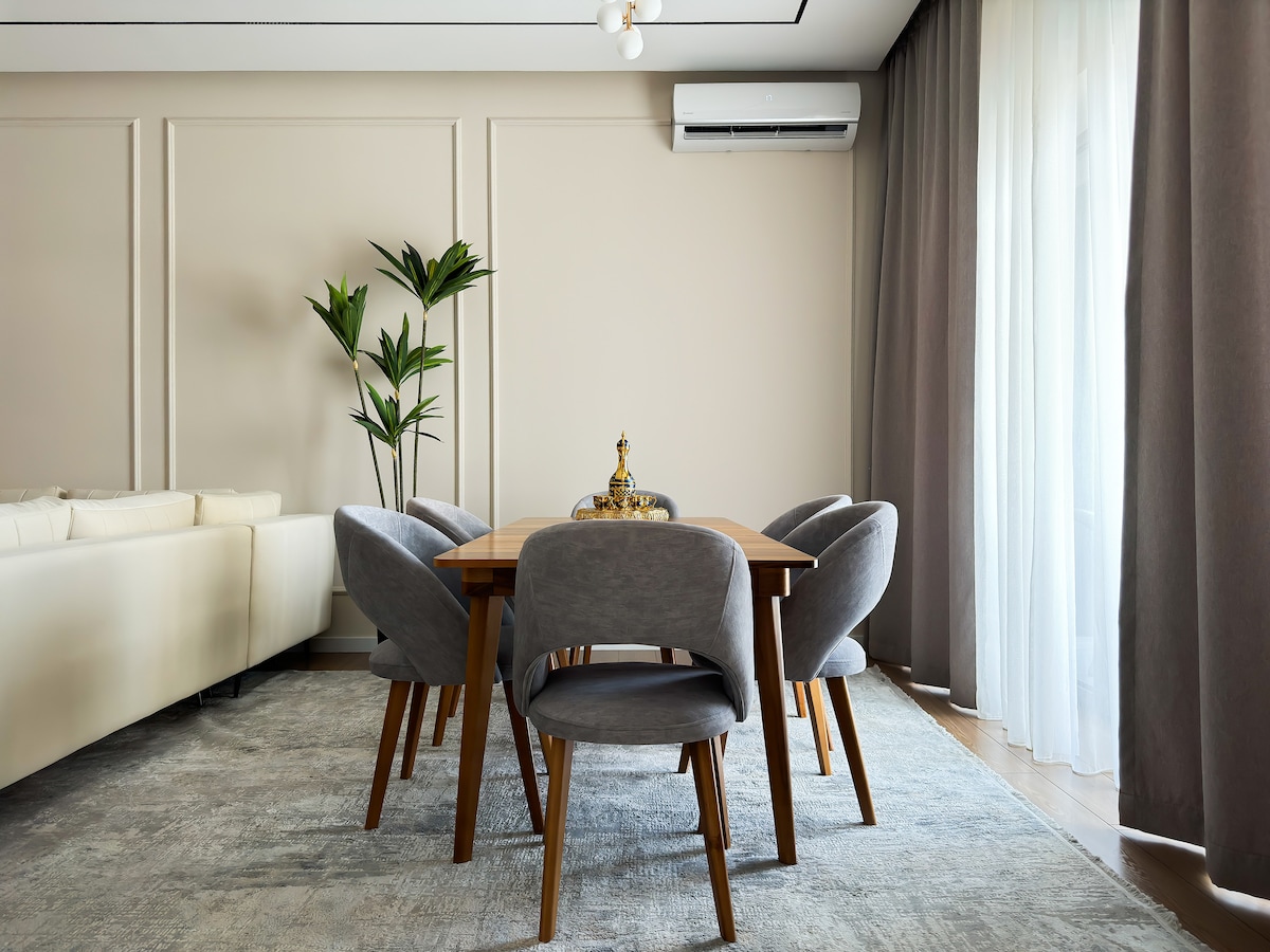 Стильная студия в новом здании Prestige Gardens, расположена в 5 минутах езды от аэропорта и Южного вокзала. - 1 двуспальная кровать - 1 раскладной диван - Свежий ремонт - Есть все для комфортного проживания: WIFI, Smart TV -Холодильник, стиральная машина - Оборудованная кухня - Кондиционер, утюг, фен - Бесплатная парковка возле здания - Станция для зарядки электромобиля - Удобное расположение, до центра города 10 минут езды - Наличие ресторанов и супермаркетов поблизости