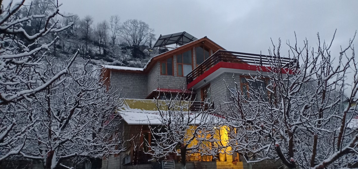 A true-blue working Apple orchard, barely 400 meters from the iconic & world-famous NAGGAR CASTLE, in a quaint little village called Chanalti. It is a rustic village set-up but fitted with all modern-day comforts - along with unending cups of herbal tea, coffee & stories to share! It is a place where the air is always fresh, the views are always stunning, and our hospitality is always homely, warm and welcoming! Min 2 Night Stay required! Pls. DO NOT book for 1 Night. STAGS NOT ALLOWED 🚫