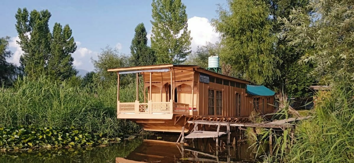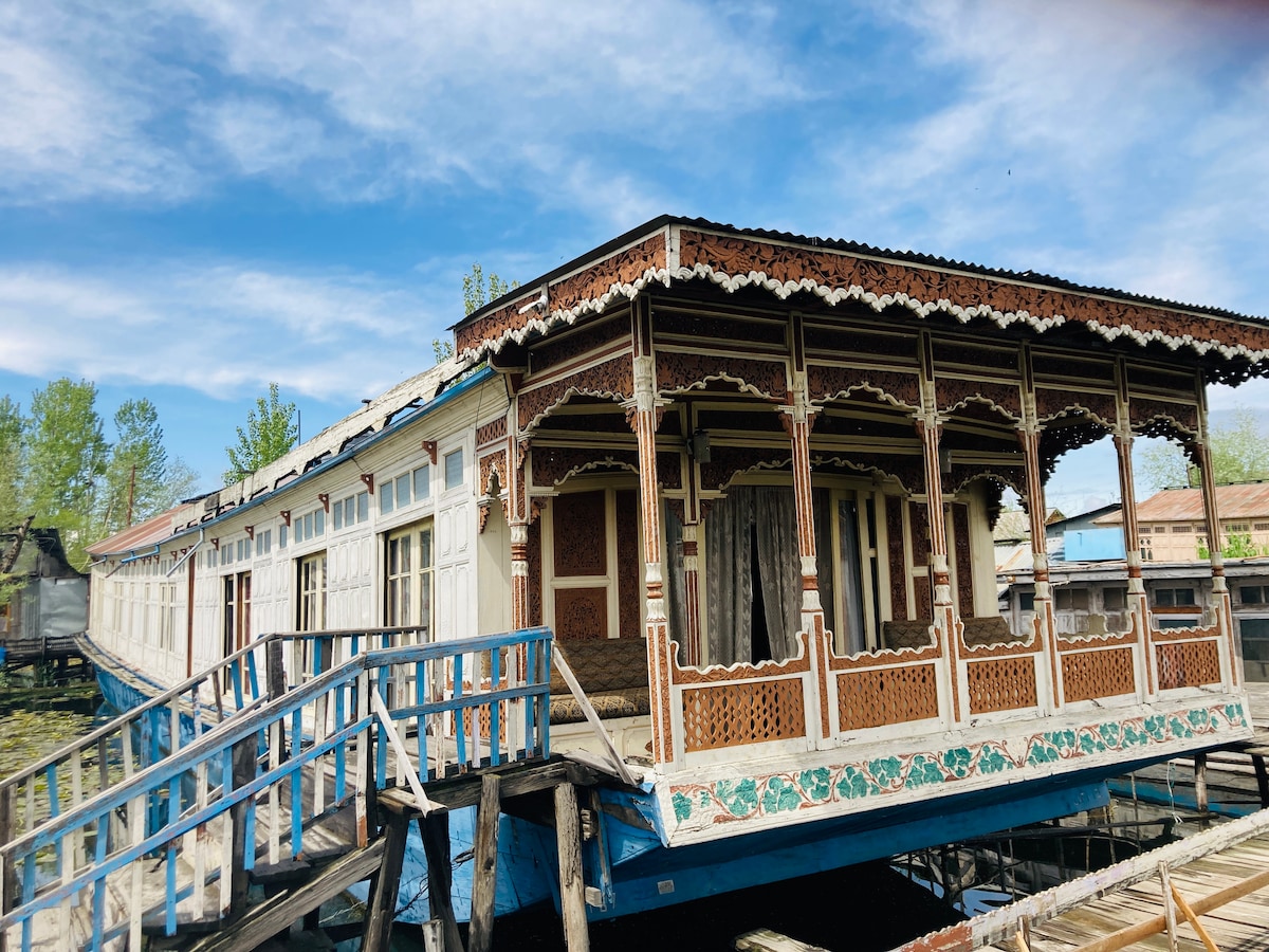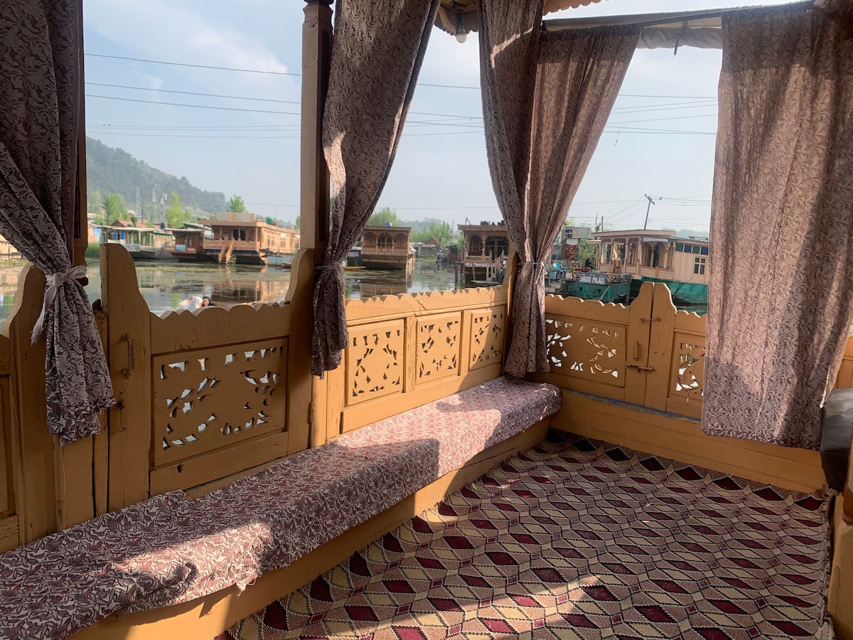 Traditional houseboat located on Dal Lake facing the Zabarvan Mountains in a peaceful area. We have been happily serving our guests from all over the world for 90+ years. Enjoy a scenic view of lotus farms and water lilies with sights of migratory birds. Houseboat is divinely decorated with traditional Kashmiri furniture and upholstery. Perfect for a relaxing gateway. Our houseboat includes unlimited high-speed WiFi and comfortable seating areas ideal for WFH.