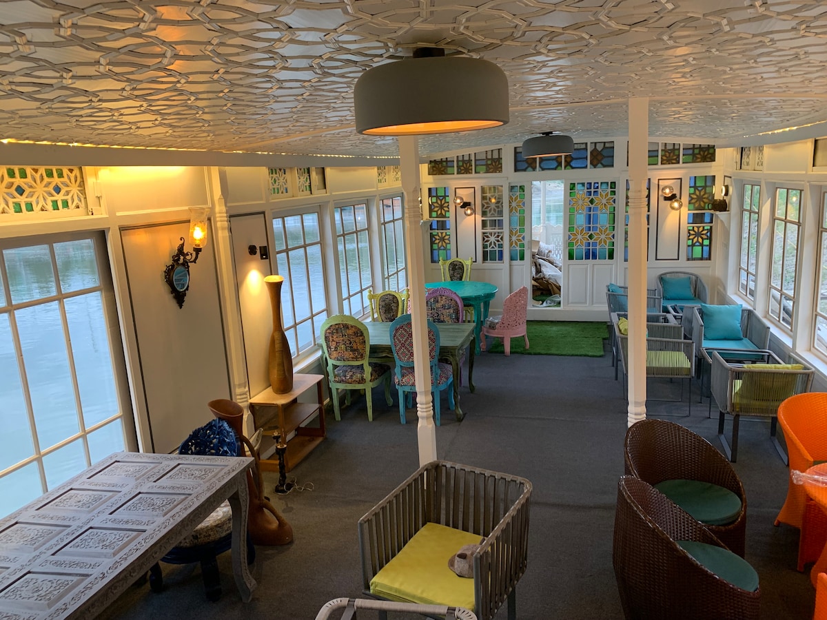 This Property is first & only one in kashmir to have a cafe in a houseboat & located in the heart of city yet has a vibe of a small hamlet .Surrounded by magnificent views, one can see sunrise/sunset, mountains, river view from bedroom windows. Equipped with best in class fittings to make sure you have a comfortable stay. Quite, peaceful, serene & comfortable.Stay with us to get an immersive experience of Kashmiri Hospitality. Prices include breakfast or Dinner