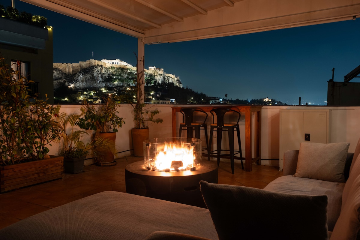 Once in a while you are lucky enough to discover a kind of space that's in the heart of Athens yet feels like a world away. This serene penthouse, located on Ermou street was made to entertain. Designed to comfortably host 4 people it features majestic views of the Acropolis while being just 5 min away from Athens' major attractions. Imagine drinking a glass of wine overlooking the Acropolis hill in front of your firepit.