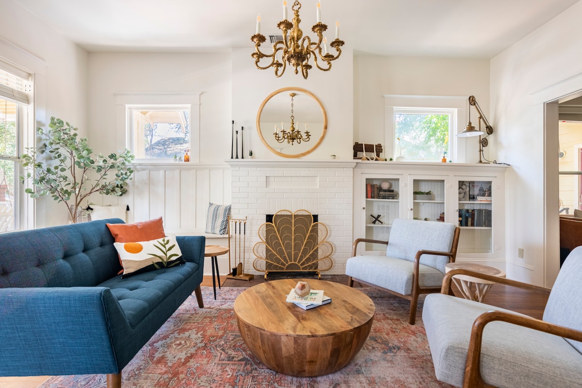 Top 1% _WORLD, Gr8 for Moody Center(1.1mi). High-Frequency Bus, IT'S CLOSER THAN THE UBER DROP-OFF. Easy Self Check-In with a key code. Privacy & 5STAR AMENITIES. Cable/Netflix, Dolby Atmos Sound, Bidet, Fireplaces, endless hot water, Wifi & Wired. Free parking, less than $10 uber to downtown. Eco-Friendly, Healthy stay, with Dyson, Vitamix, Frame TV, and Kitchenaid. Enjoy the historic wood floor under your bare feet in a charming Solar-Powered 1930s bungalow under a 100yr old Pecan Tree.